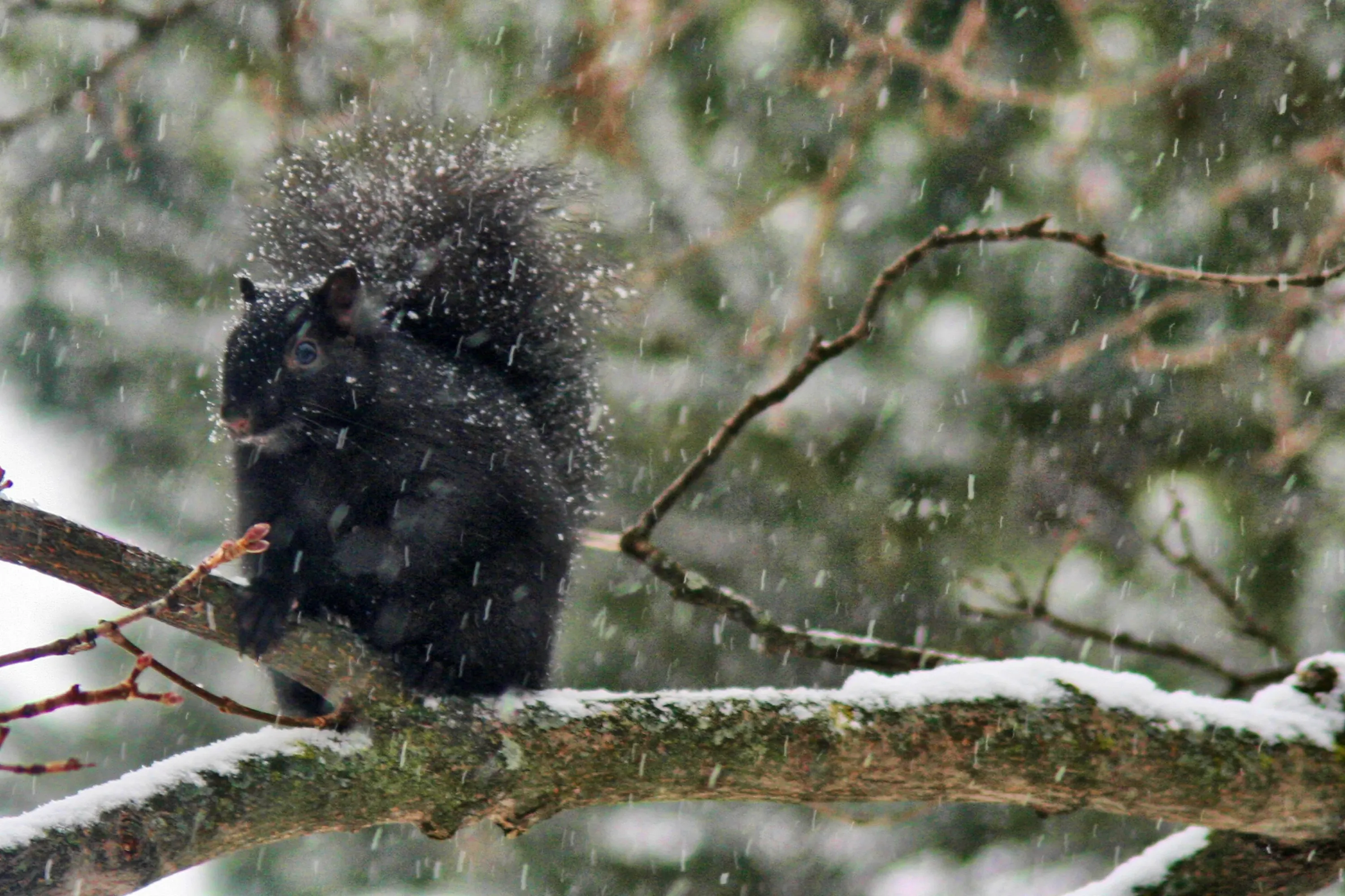 Black squirrel sits on a branch as light snow falls in the city of Toronto, Ontario, Canada, on December 11, 2022. (Photo by Creative Touch Imaging Ltd./NurPhoto via Getty Images)