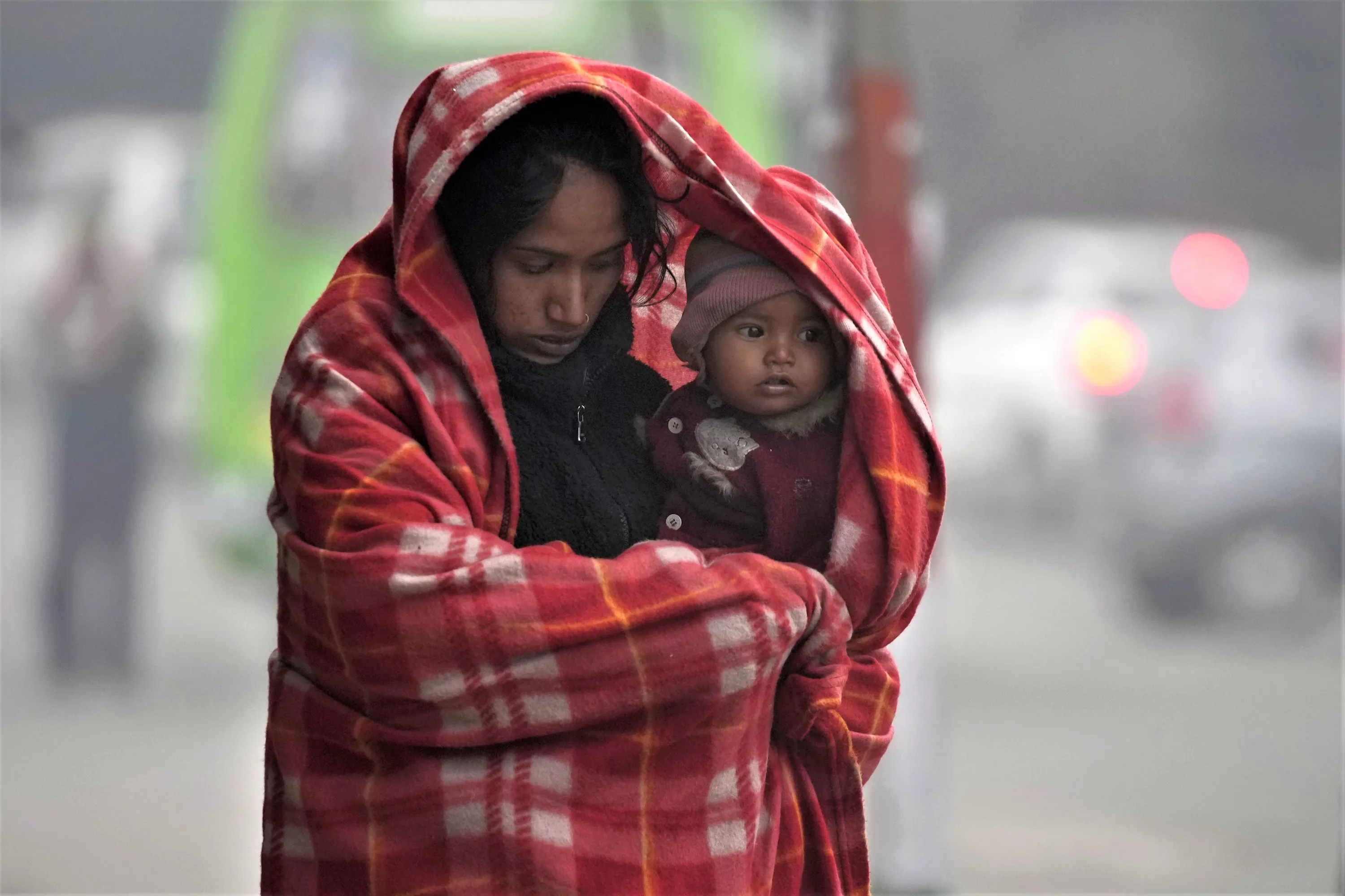 A homeless woman carries her child, both wrapped in a blanket, on a cold and foggy morning in Jammu, India, Tuesday, December 27, 2022. (Photo by Channi Anand/AP Photo)