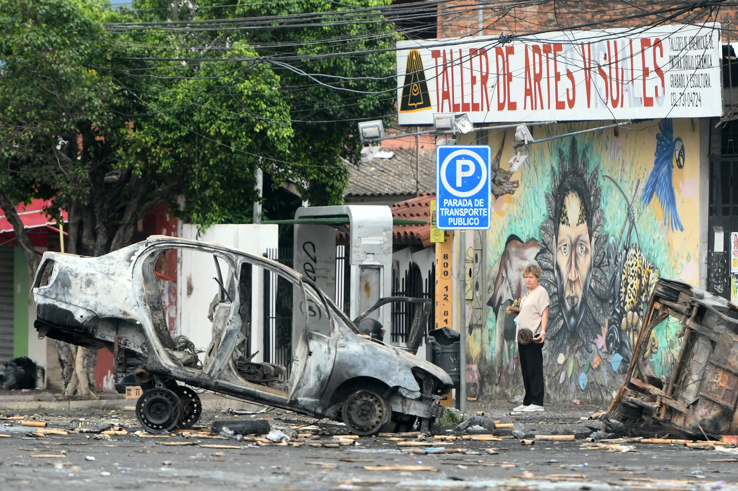 A cyclist passes near cars destroyed during the night in clashes between demonstrators opposing the arrest of the Governor of Santa Cruz, and the police, in Santa Cruz, Bolivia, on January 1, 2023. Protesters have been clashing with police in Bolivia's largest city after a court sentenced key opposition leader Luis Fernando Camacho to four months in pre-trial detention on charges of terrorism. Camacho, the right-wing governor of the country's economic powerhouse region of Santa Cruz, was arrested on December 28, 2022, on “terrorism charges”, including for an alleged role in the resignation of leftist president Evo Morales in 2019. (Photo by Rodrigo Urzagasti/AFP Photo)