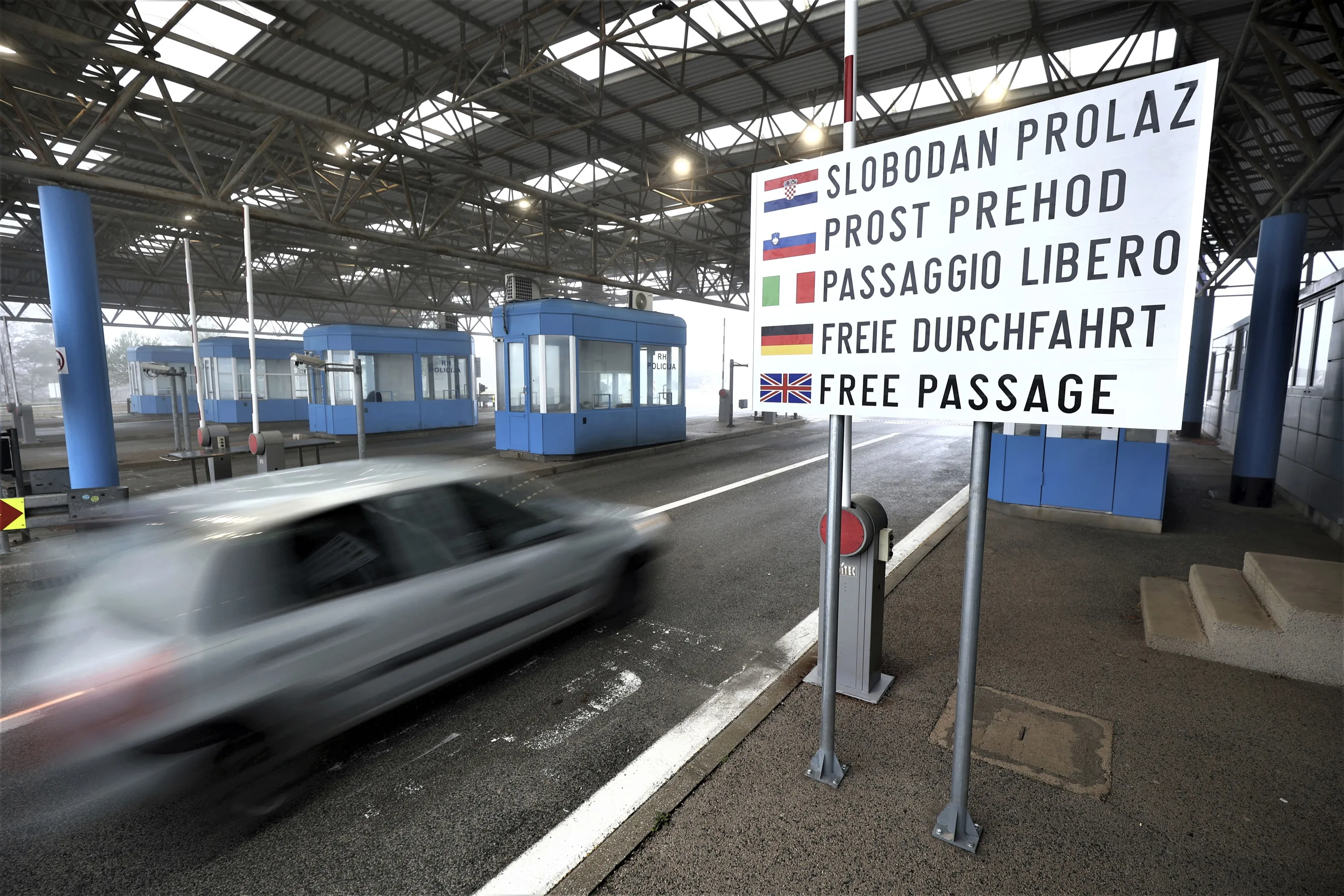 Cars pass through the Rupa border between Croatia and Slovenia by without interruption, Croatia, Sunday, January 1, 2023. At the stroke of midnight on Saturday, Croatia switched to the shared European currency, the euro, and removed dozens of border checkpoints to join the world's largest passport-free travel area, completing a dream conceived 30 years ago when it fought a war for independence from Yugoslavia in which 20,000 people were killed and hundreds of thousands displaced. (Photo by Armin Durgut/AP Photo)