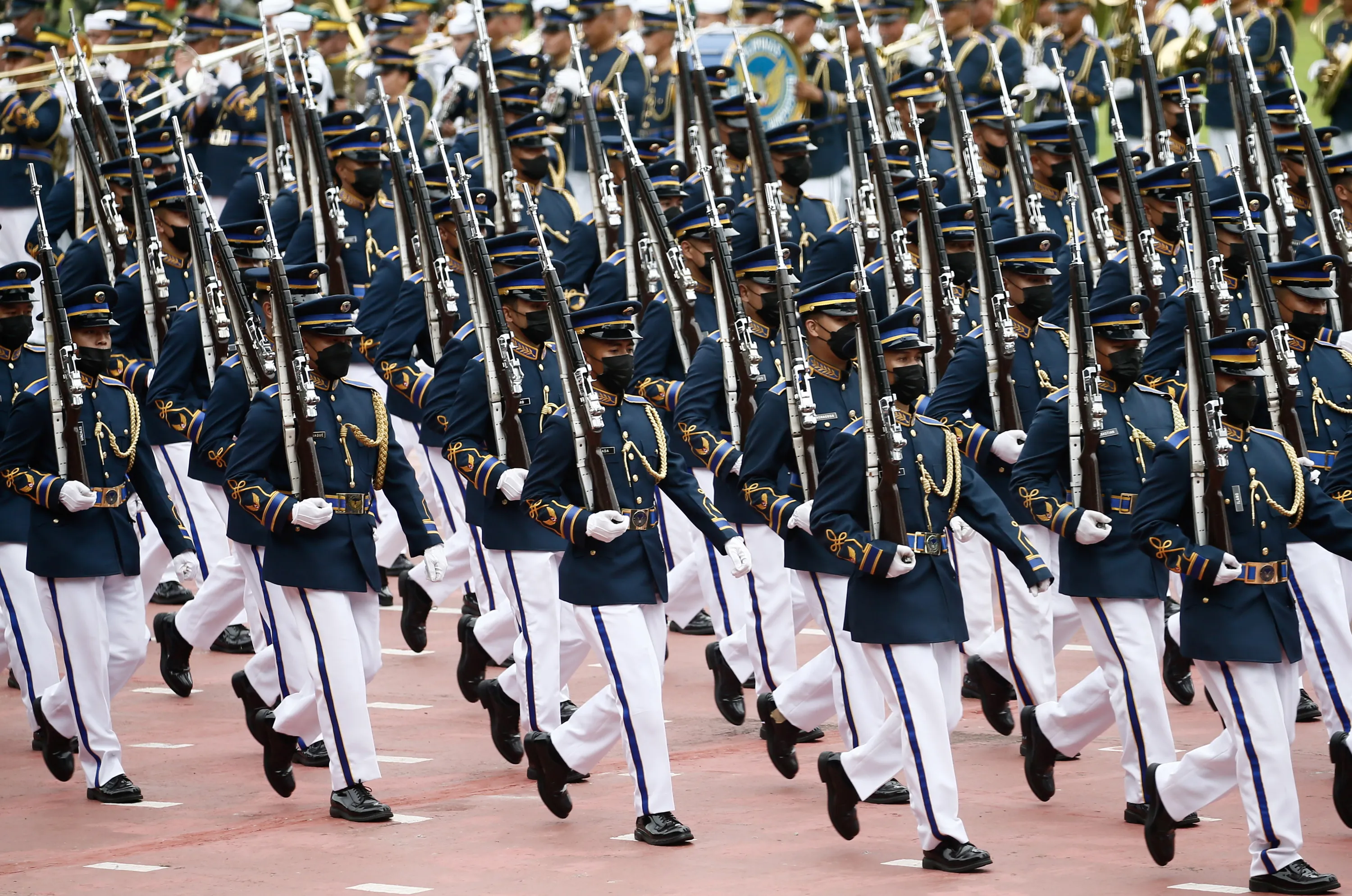 Philippine soldiers march in parade grounds during rites marking the 87th Armed Forces of the Philippines (AFP) anniversary at Camp Aguinaldo in Quezon City, Metro Manila, Philippines 19 December 2022. President Ferdinand Marcos Jr., led the ceremony to acknowledge distinguished individuals in the military service and honor the memory of soldiers who sacrificed their lives in the service. (Photo by Rolex Dela Pena/EPA/EFE)