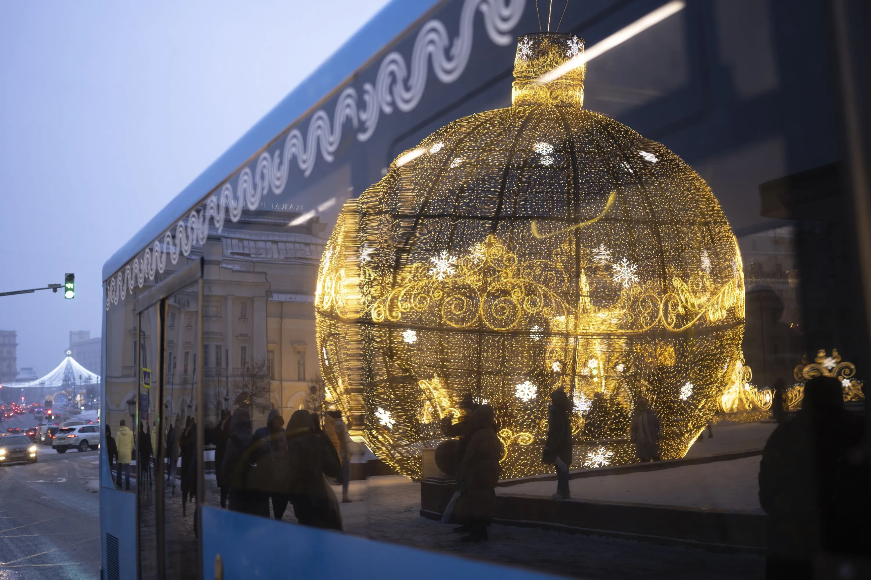 Decorations for the New Year and Christmas festivities are reflected in a bus window passing Teatralnaya (Theater) Square in Moscow, Russia, Tuesday, December 27, 2022. The temperature in Moscow is around -–4 degree Celsius (24.8 degree Fahrenheit). (Photo by Alexander Zemlianichenko/AP Photo)