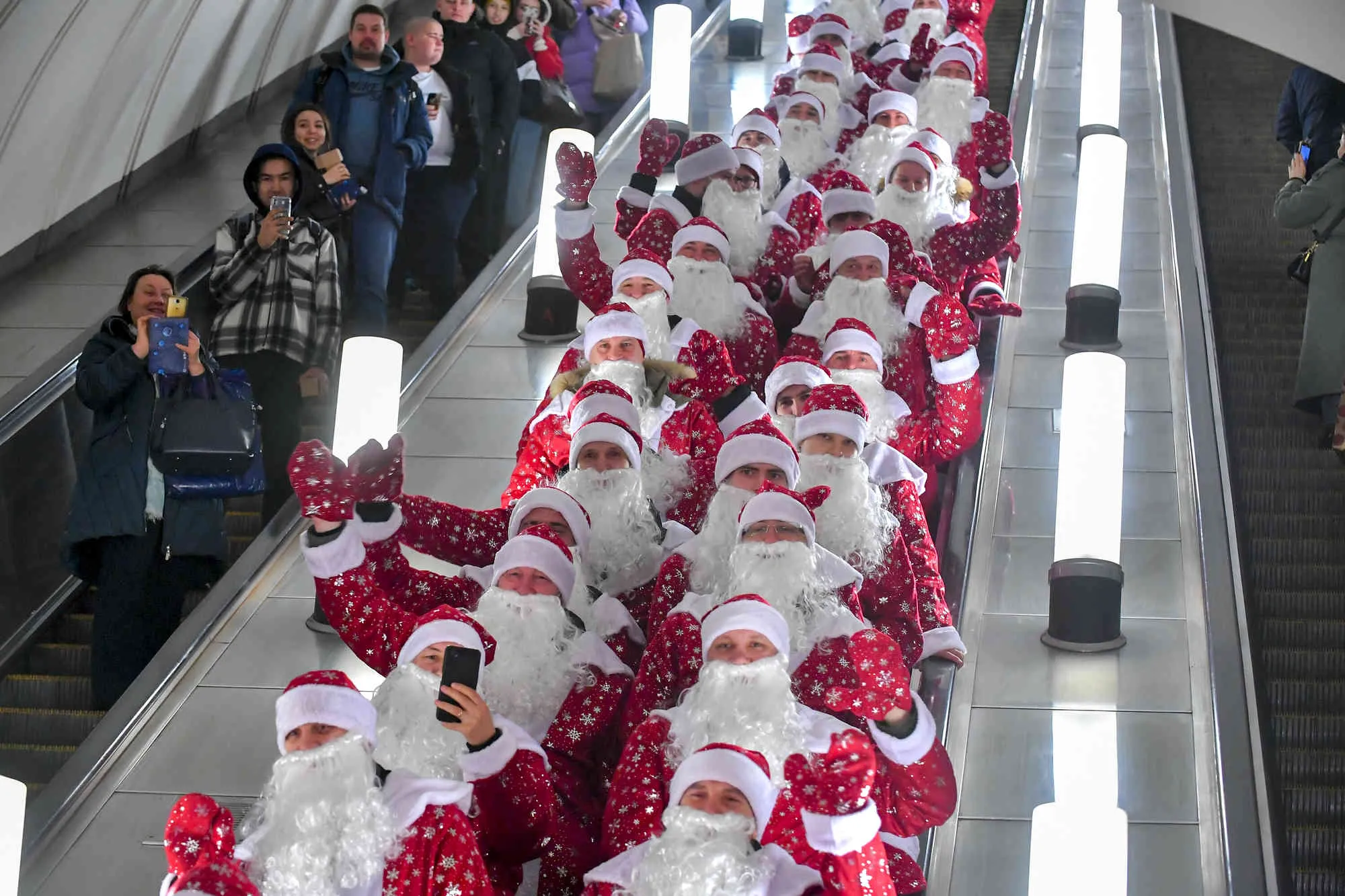 People dressed as Ded Moroz, Grandfather Frost, the Russian Santa Claus, attend an annual flash mob in Moscow's Metro (Subway) in Moscow, Russia, Friday, December 30, 2022. (Photo by Sergei Kiselev, Moscow News Agency photo via AP Photo)