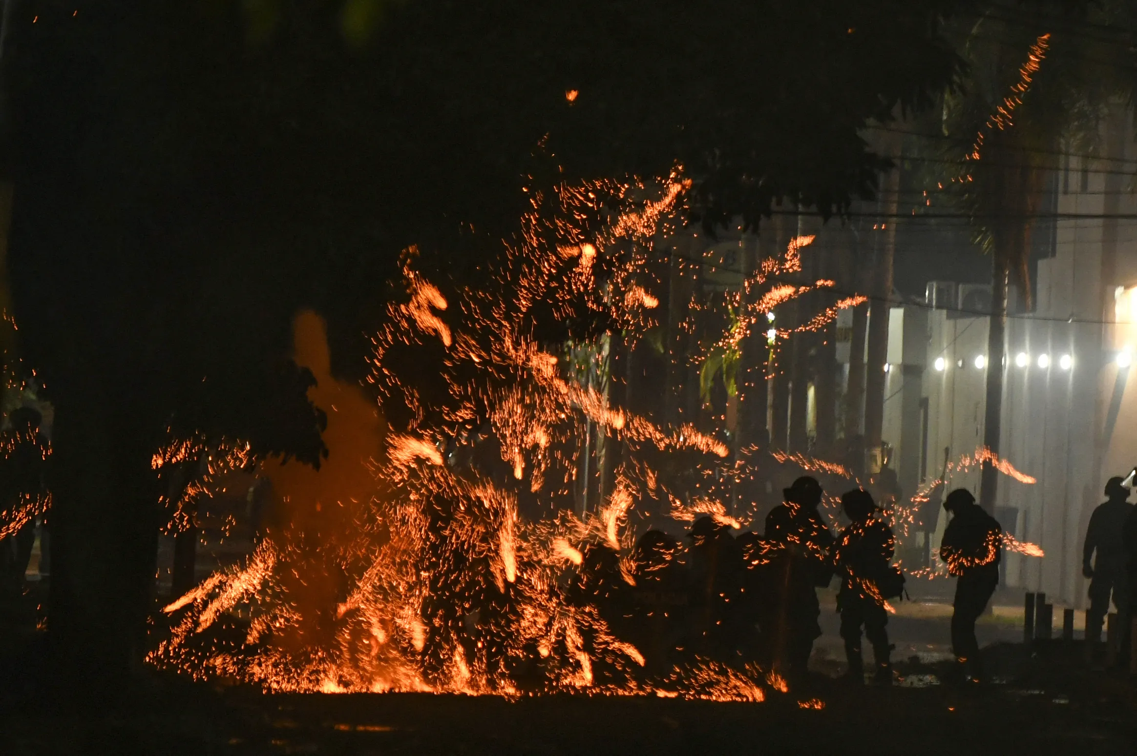 Police officers are struck by flares thrown by demonstrators demanding the release of the Governor of Santa Cruz, Luis F. Camacho at the gates of the Police Departmental Command in Santa Cruz, Bolivia on the early hours of January 4, 2023. Protesters have been clashing with police in Bolivia's largest city after a court sentenced key opposition leader Luis Fernando Camacho to four months in pre-trial detention on charges of terrorism. Camacho, the right-wing governor of the country's economic powerhouse region of Santa Cruz, was arrested on December 28, 2022, on “terrorism charges”, including for an alleged role in the resignation of leftist president Evo Morales in 2019. (Photo by Rodrigo Urzagasti/AFP Photo)