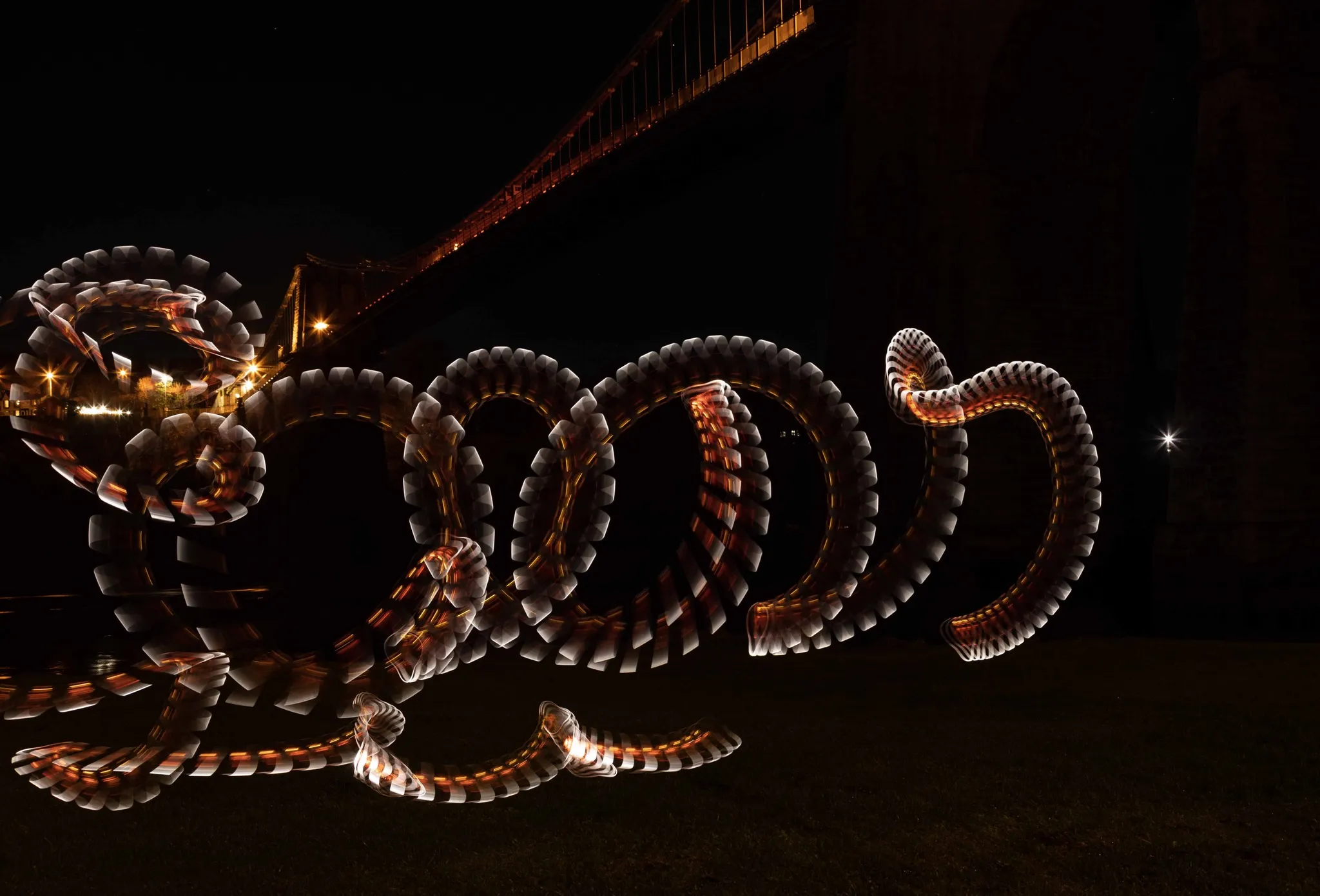 One of the light paintings is seen under the Menai Bridge in North Wales, United Kingdom on January 2, 2023. (Photo by Myo Tint Photography)