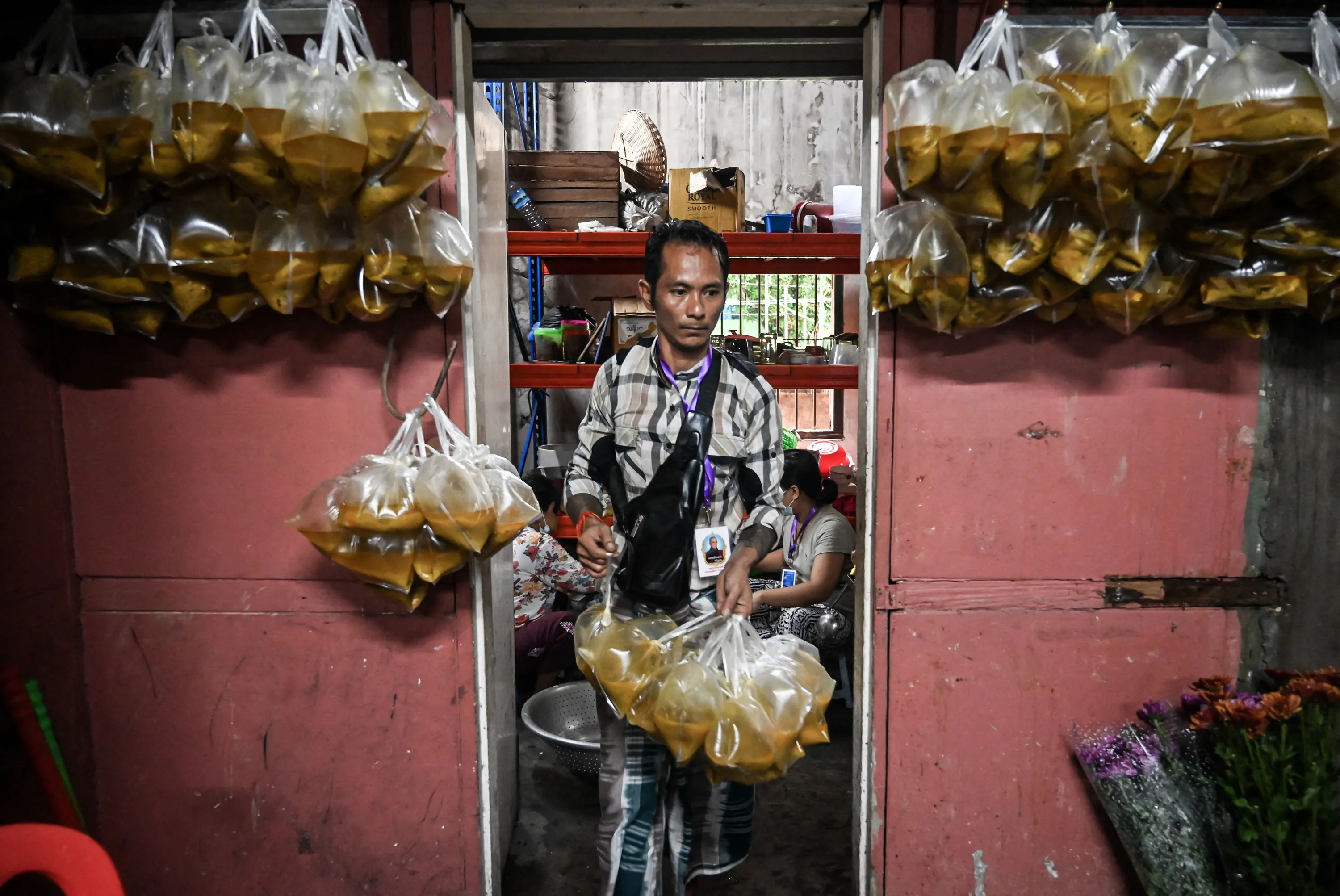 This photo taken on August 17, 2022, in Yangon, shows a volunteer preparing free meals to distribute. (Photo by AFP Photo/Stringer)