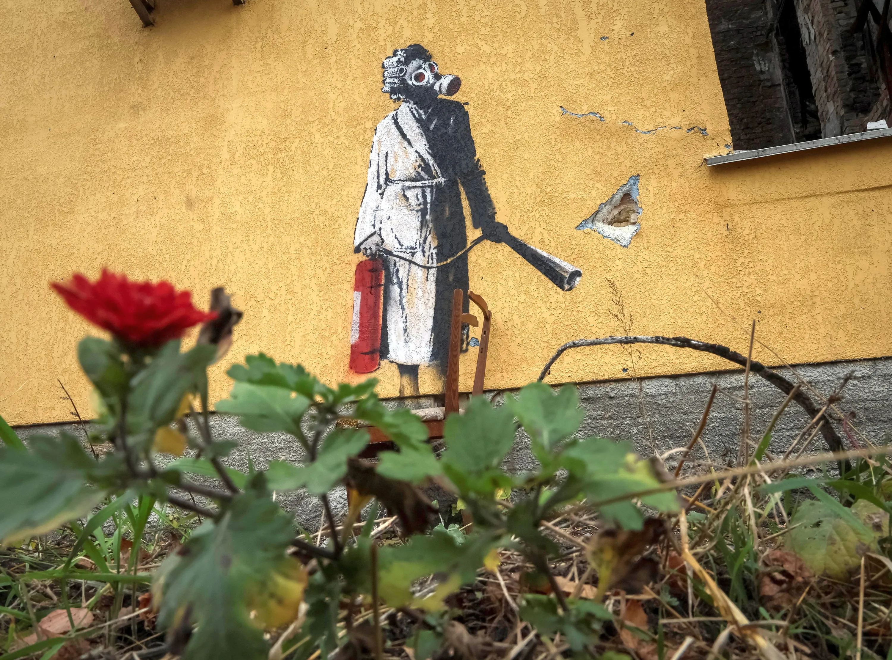 A new graffiti in Banksy's signature style, although not posted by the mercurial artist on social media, is seen on the wall of a destroyed building in the Ukrainian town of Hostomel, which had been occupied by Russia until April and heavily damaged by fighting in the early days of Russian invasion on November 13, 2022. (Photo by Gleb Garanich/Reuters)