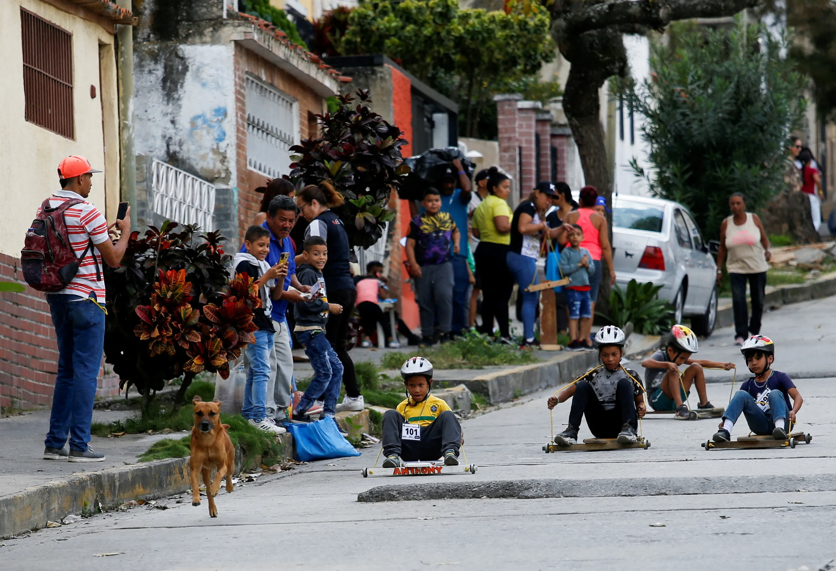 Children participate in a traditional street race with wooden makeshift carts called “carruchas”, in Caracas, Venezuela on December 17, 2022. (Photo by Leonardo Fernandez Viloria/Reuters)