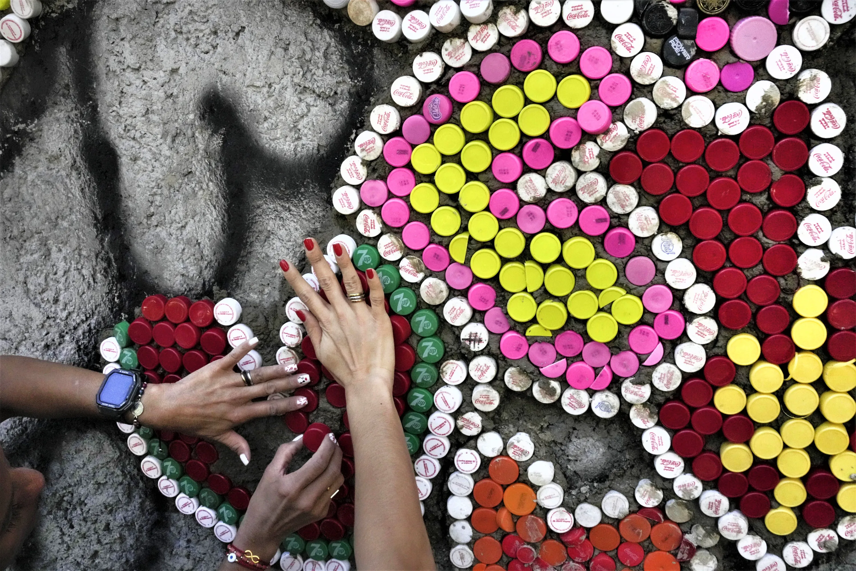 Women attach bottle caps to a wall in Los Caobos public park in Caracas, Venezuela, Wednesday, December 21, 2022. A Venezuelan artist organized a project with recycled bottle caps titled “Wall of Love”, in order to raise awareness of those who have been affected by climate change in Venezuela and the world. (Photo by Matias Delacroix/AP Photo)