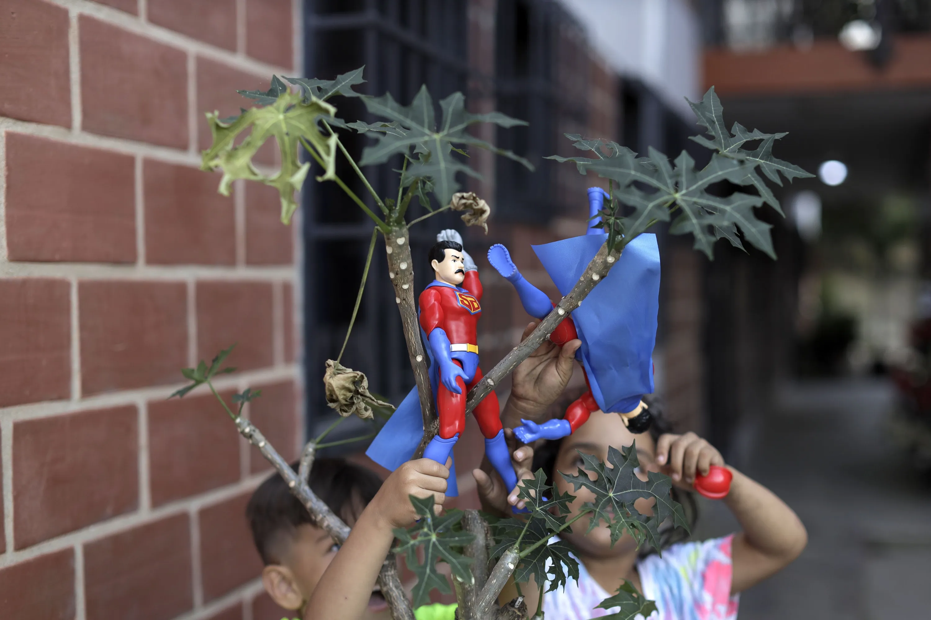 Children play with “Super Bigote” or Super Mustache dolls in the Carayaca neighborhood of La Guaira , Venezuela, Tuesday, December 27, 2022. The delivery of toys of “Super Bigote” and “Cilita” dolls based on the image of Venezuelan President Nicolas Maduro and his wife Cilia Flores, were handed to thousands of children this Christmas, causing controversy among some Venezuelans. (Photo by Jesus Vargas/AP Photo)