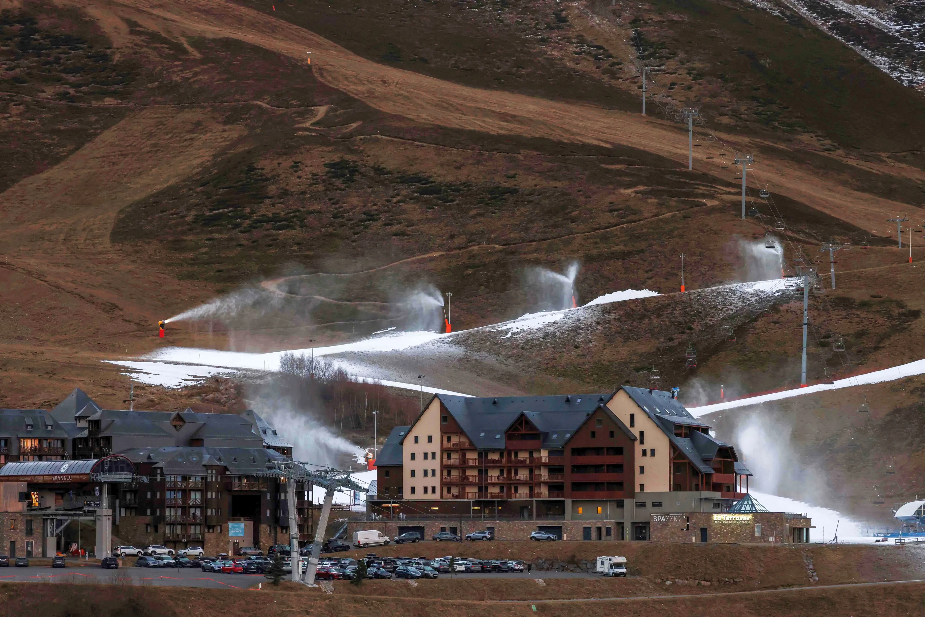 This photograph shows a general view of snow cannons operating due to lack of snow at the Peyragudesski resort, southwestern France on January 5, 2023. (Photo by Charly Triballeau/AFP Photo)