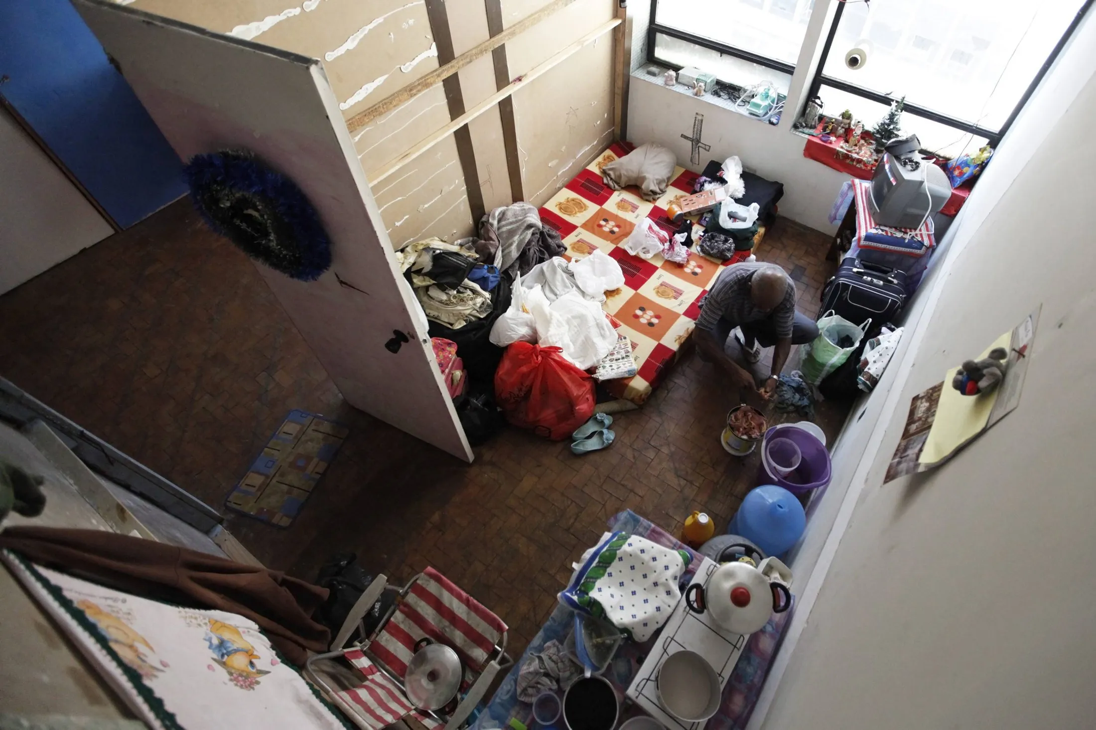 A member of Brazil's Movimento dos Sem-Teto (Roofless Movement) cooks inside the space he closed off with plywood, in one of the 11 empty buildings that the movement took over recently, in the centre of Sao Paulo, December 5, 2012. According to City Hall, there are some 400,000 people in need of stable housing, including the 4,000 families of the Roofless Movement who are squatting in abandoned or vacant buildings that range from apartment blocks to hotels, in Sao Paulo, the largest city in South America. Picture taken December 5, 2012. REUTERS/Nacho Doce (BRAZIL - Tags: POLITICS SOCIETY REAL ESTATE BUSINESS POVERTY)