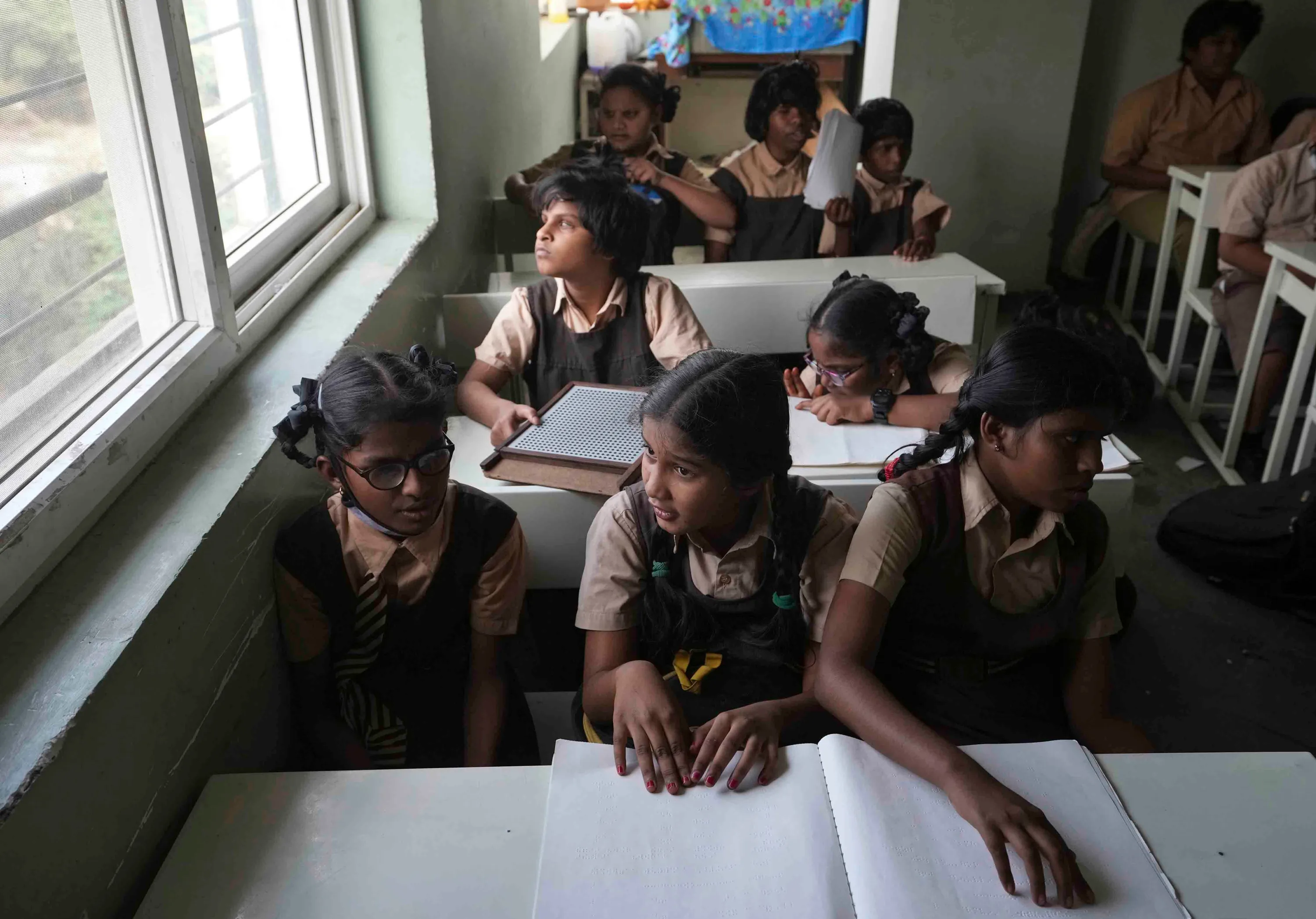 Students with visual disabilities read a book in braille at the Devnar School for the Blind in Hyderabad, India, Tuesday, January 3, 2023. World Braille Day will be observed on Jan. 4, marking the birth anniversary of Louis Braille, the French inventor who devised a system used by the blind for reading and writing. (Photo by Mahesh Kumar A./AP Photo)