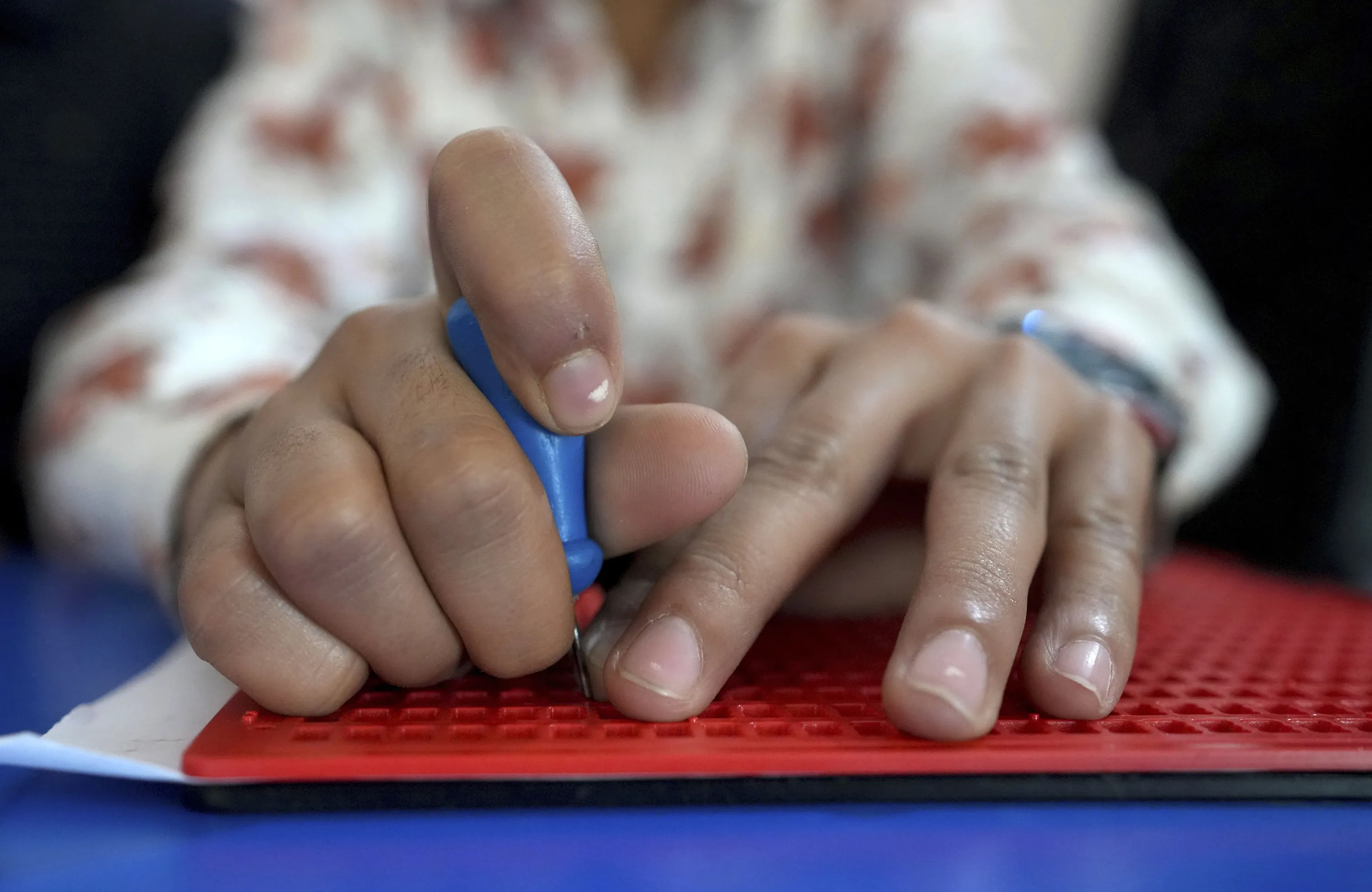 A student with visual disability writes in braille at a government-run school in Hyderabad, India, Tuesday, January 3, 2023. (Photo by Mahesh Kumar A./AP Photo)