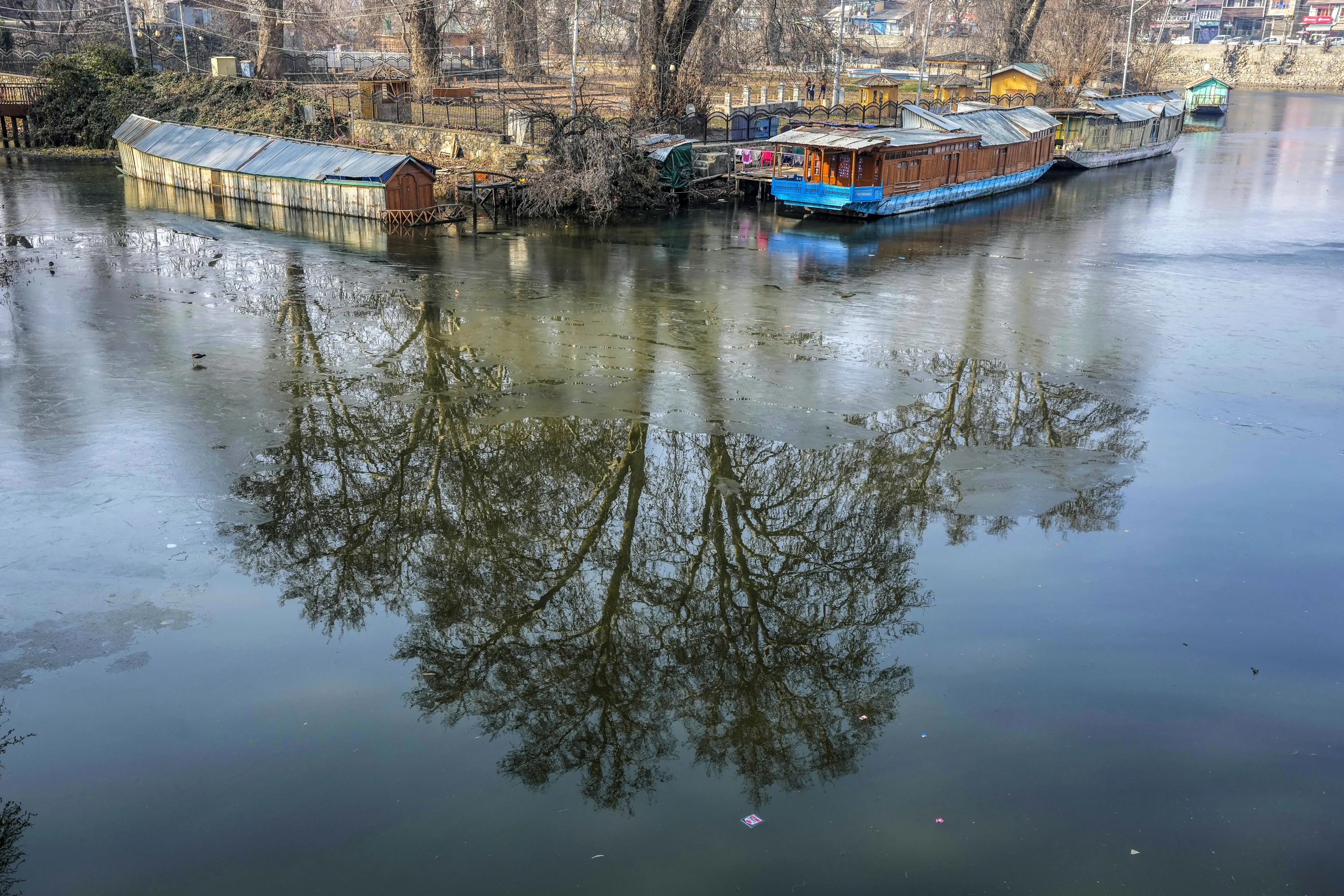 Chinar trees are reflected on the frozen Dal Lake on a cold morning in Srinagar, Indian controlled Kashmir, Wednesday, January 4 , 2022. (Photo by Mukhtar Khan/AP Photo)