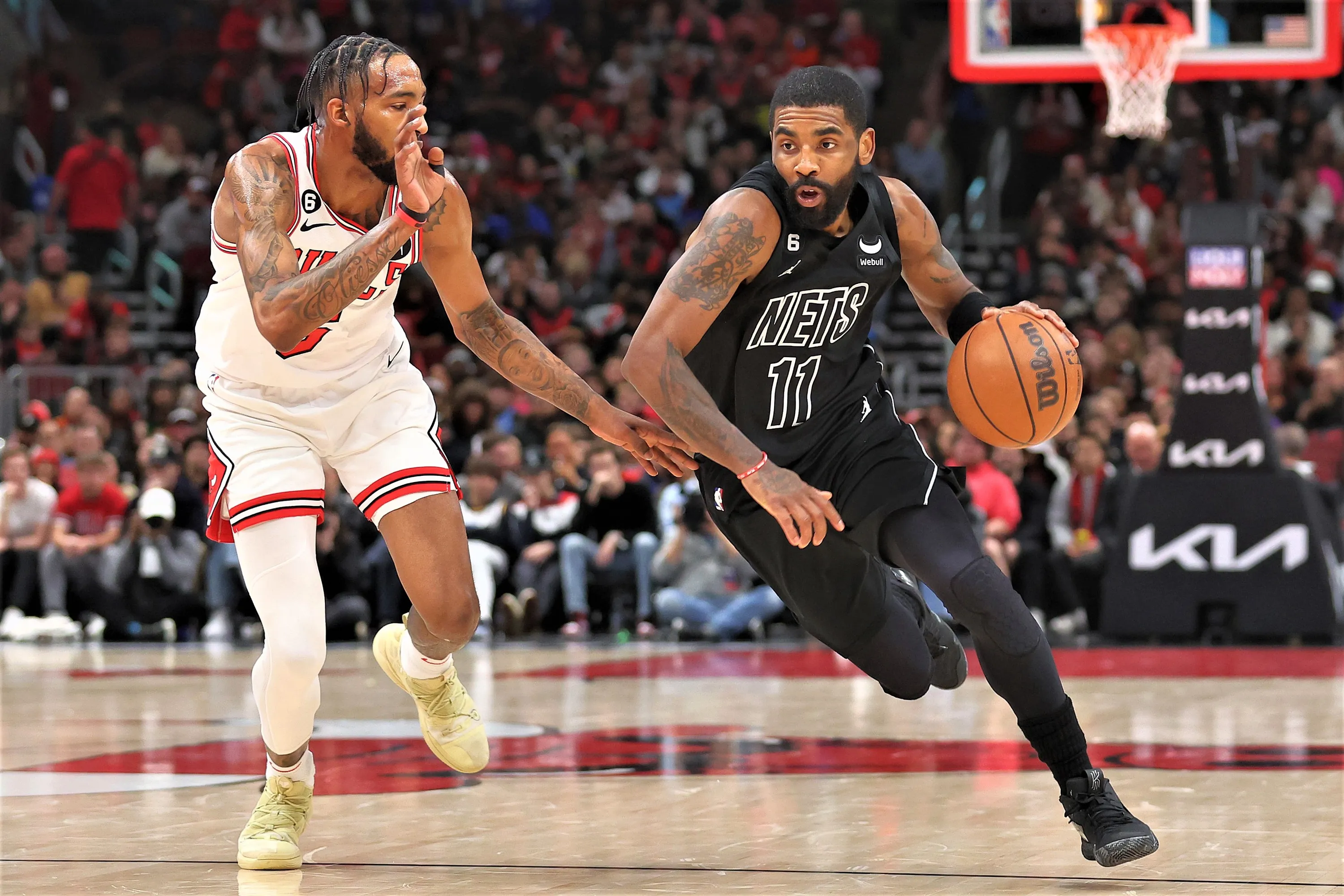 Kyrie Irving #11 of the Brooklyn Nets drives to the basket against Derrick Jones Jr. #5 of the Chicago Bulls during the first half at United Center on January 04, 2023 in Chicago, Illinois. (Photo by Michael Reaves/Getty Images)