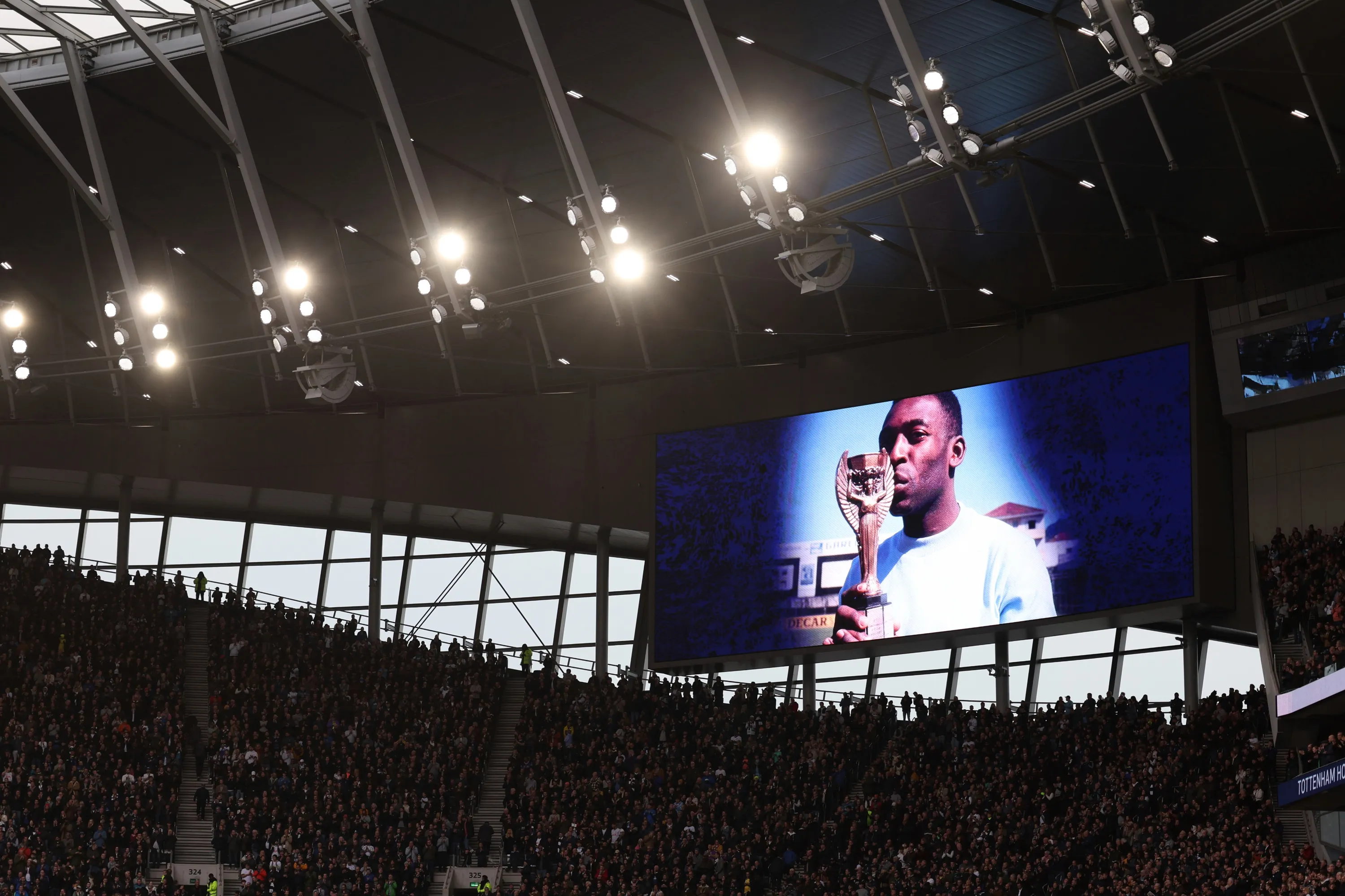 A picture of soccer legend Pele is displayed on a giant screen before the English Premier League soccer match between Tottenham Hotspur and Aston Villa at Tottenham Hotspur Stadium in London, Sunday, January 1, 2023. (Photo by Ian Walton/AP Photo)