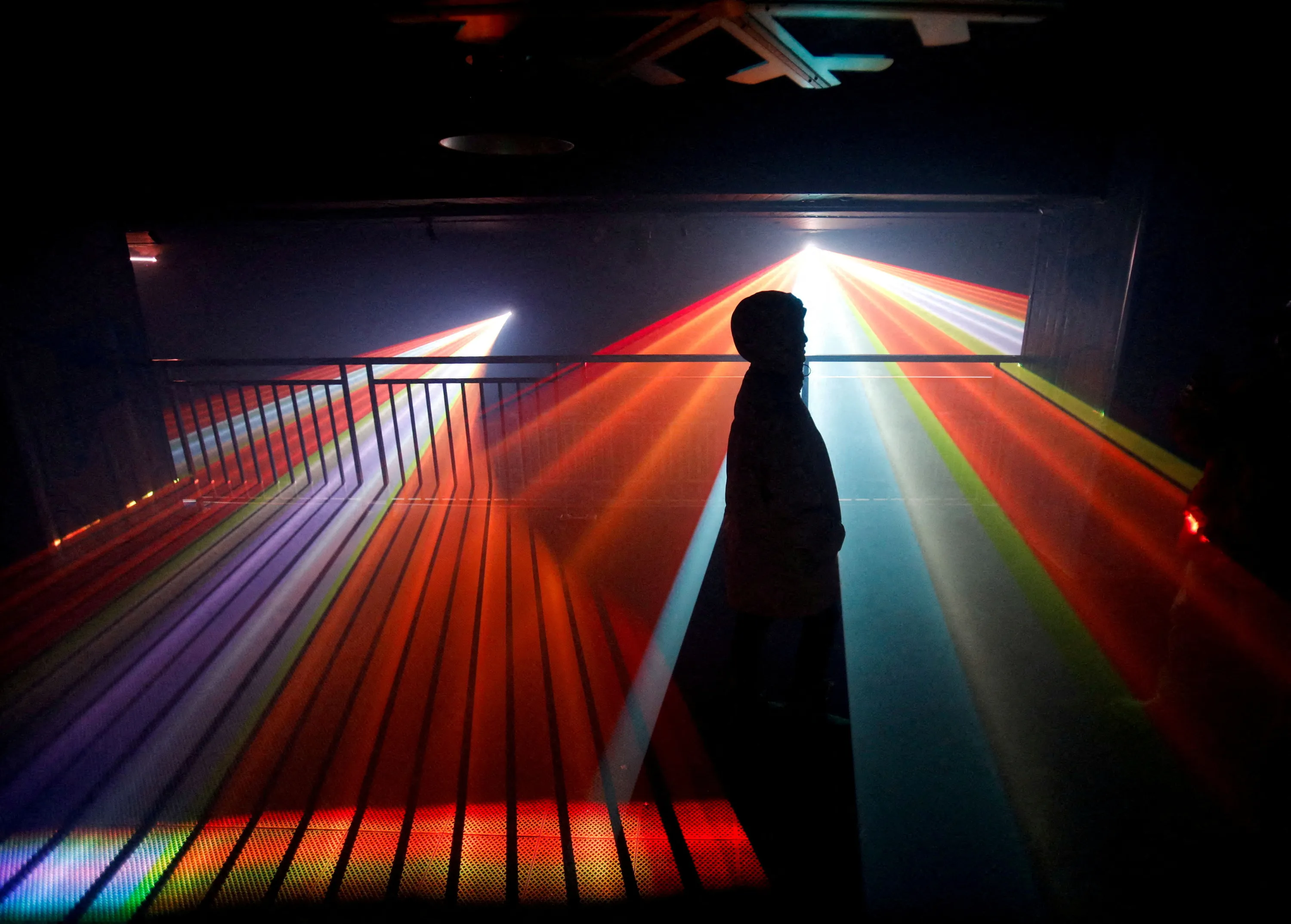 A woman walks past an artificial Aurora Borealis light show, displayed as part of the Christmas festivities at a theme park in Shah Alam, Selangor, Malaysia on December 8, 2022. (Photo by Hasnoor Hussain/Reuters)