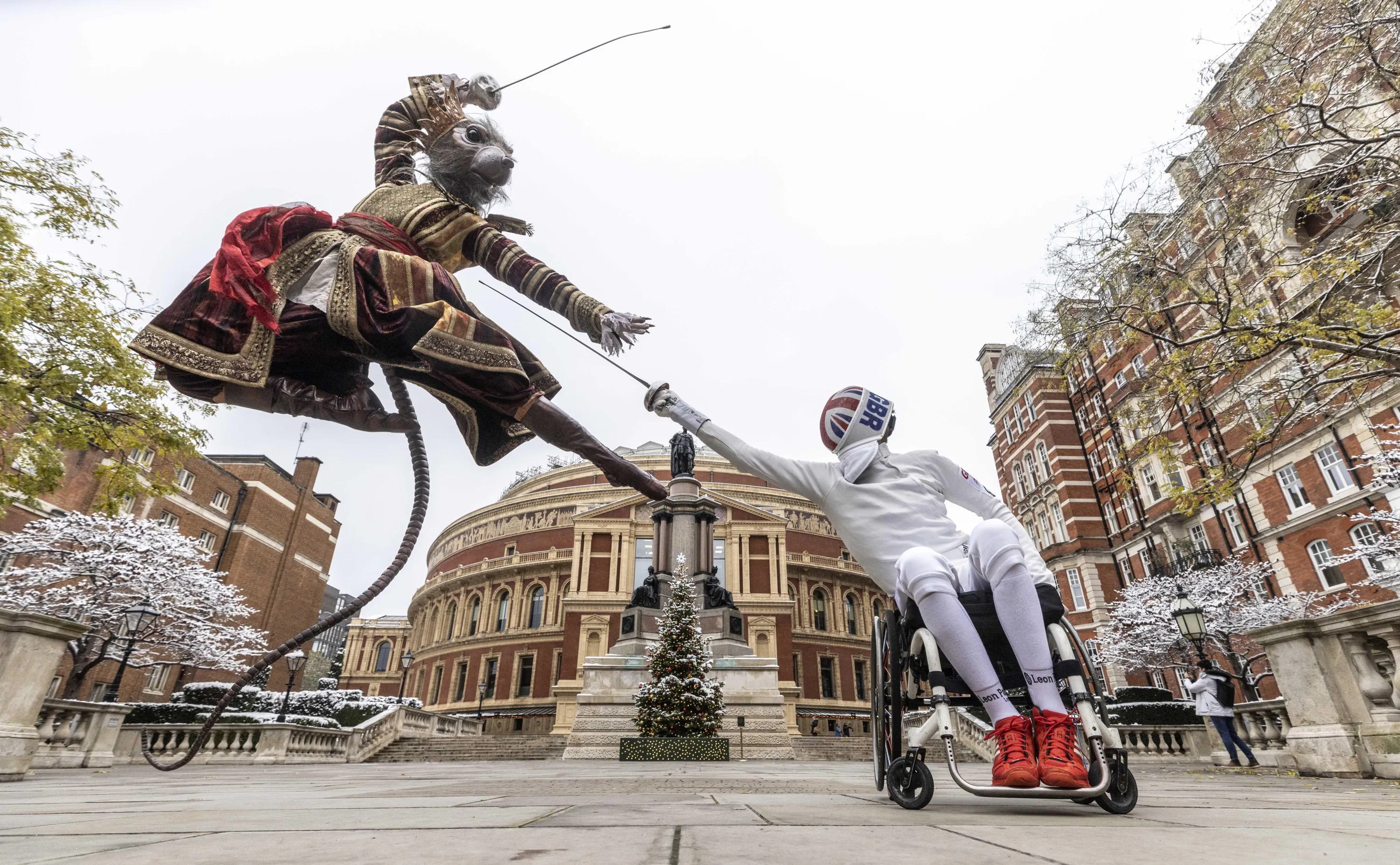 Miles Gilliver, who plays the Rat King in the Birmingham Royal Ballet production of The Nutcracker, practises with his brother Piers Gilliver, the Paralympian fencer who won gold in the Tokyo Paralympics last year, outside the Royal Albert Hall in the first decade of December 2022, where The Nutcracker will run from December 28 to 31. (Photo by Richard Pohle/The Time)