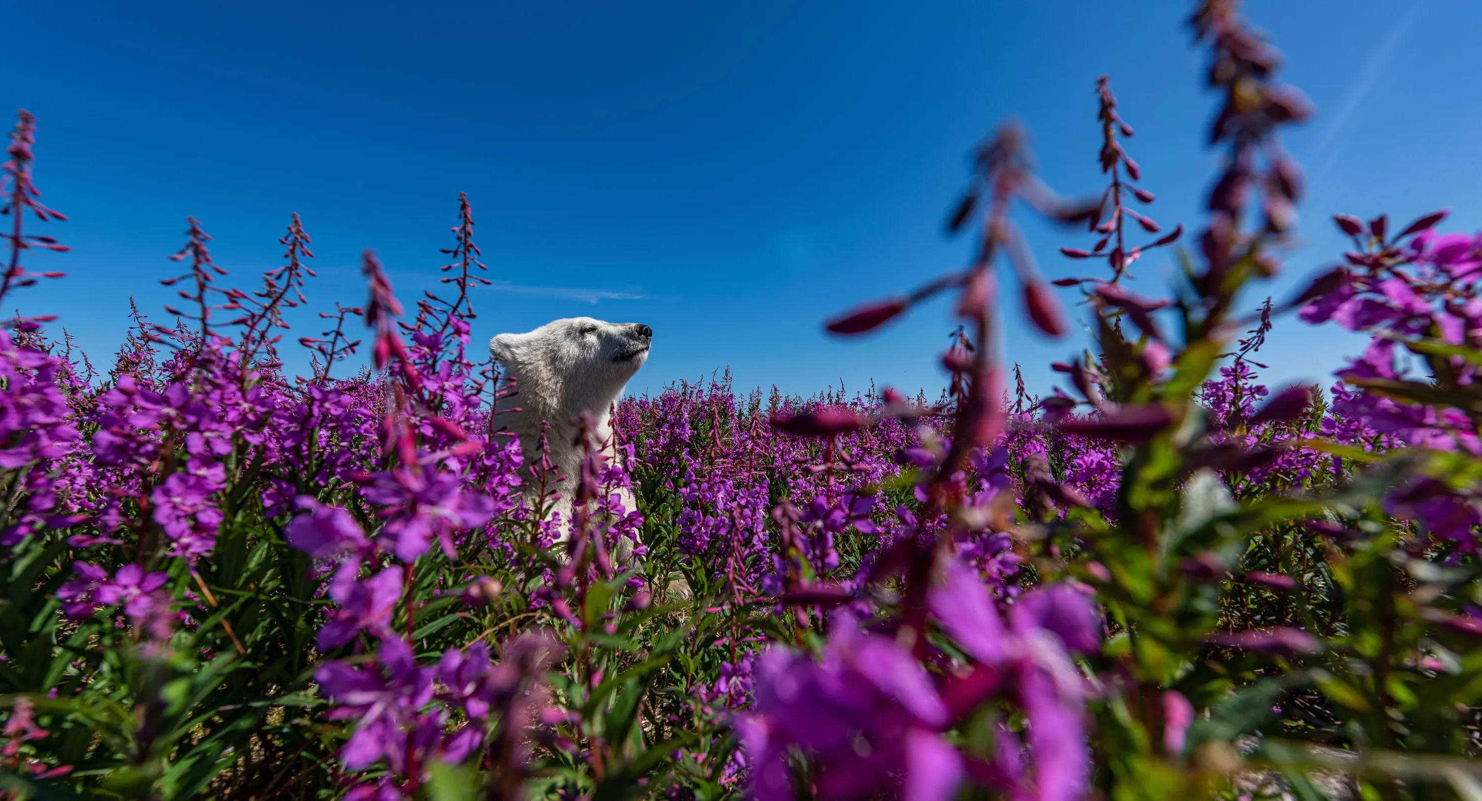 Among the flowers by Martin Gregus, Canada. Martin watched this polar bear cub playing in a mass of fireweed on the coast of Hudson Bay, Canada. Every so often the cub would stand on its hind legs and poke its head up above the flowers to look for its mother. Wanting to capture the world from the cub’s angle, Martin placed his camera at ground level and waited at a safe distance with a remote trigger. Not being able to see exactly what was happening, Martin had to judge the right moment when the bear would pop up in the camera frame. (Photo by Martin Gregus/Wildlife Photographer of the Year)