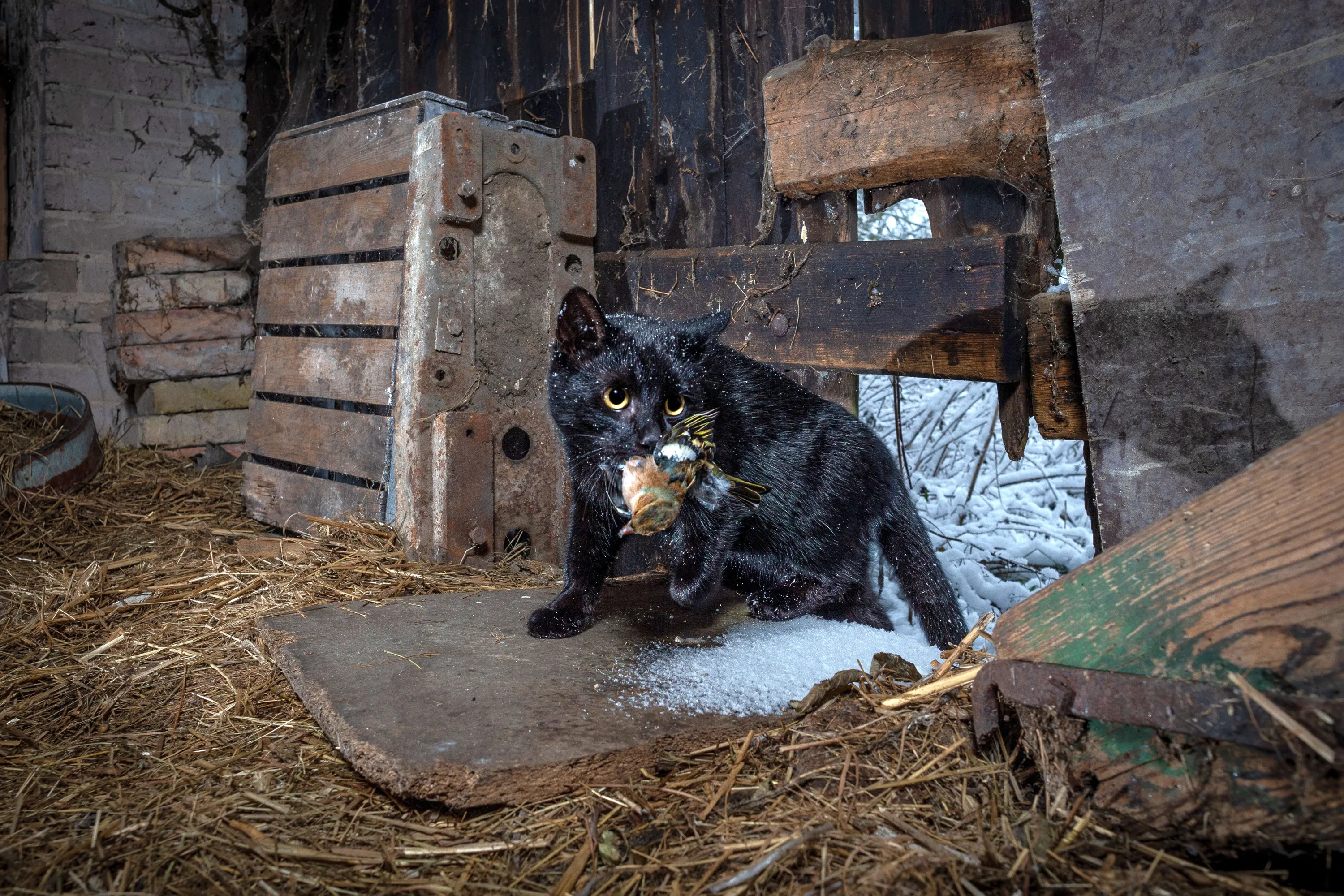 Caught by the cat by Michał Michlewicz, Poland. Michał had noticed a lot of animals were visiting this abandoned barn in Radolinek, a small village in western Poland, probably following the scent of rodent prey. With the use of his trail cam, Michał logged a badger, a fox and a marten, and a lot of cat activity. He set up a camera trap inside the barn and waited to see what would trigger it. Luckily, though not for this chaffinch, a domestic cat arrived with its fresh kill. Michał is keen to illustrate the impact of domestic cats on local ecosystems. (Photo by Michał Michlewicz/Wildlife Photographer of the Year)