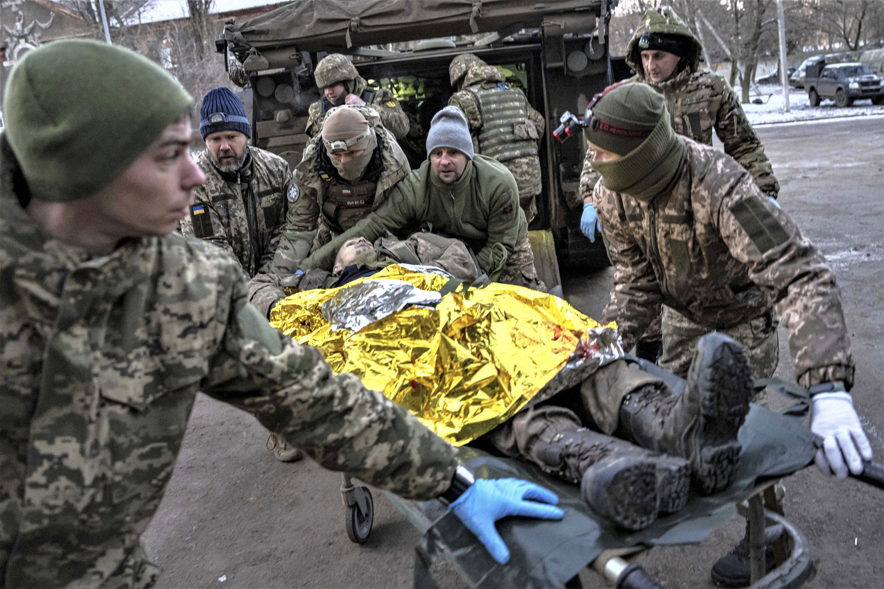 Ukrainian military medics carry an injured Ukrainian serviceman evacuated from the battlefield into a hospital in Donetsk region, Ukraine, Monday, January 9, 2023. The serviceman did not survive. (Photo by Evgeniy Maloletka/AP Photo)