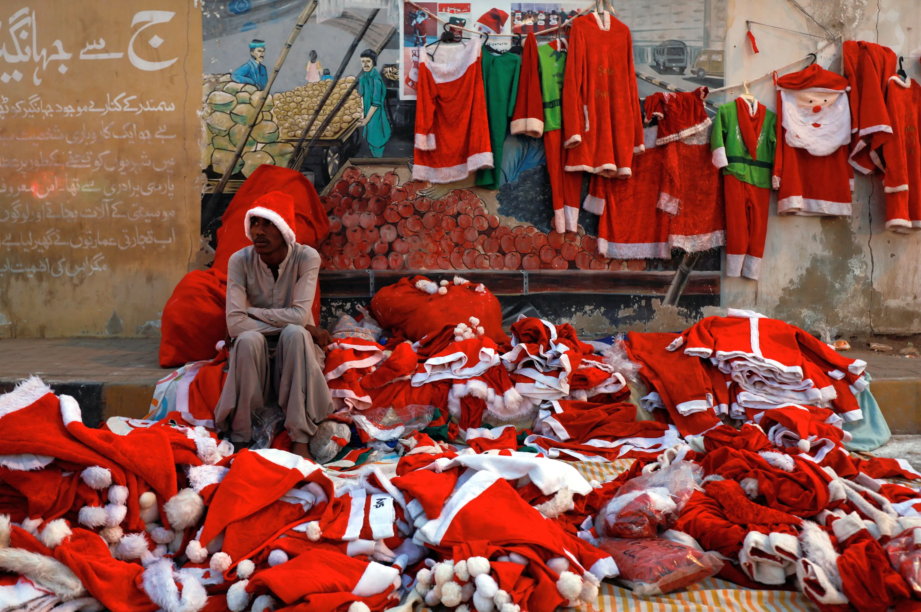 Jason, 17, waits for customers as he sells Santa Claus costumes, in front of the St. Patrick's Cathedral, on the Christmas eve celebrations, in Karachi, Pakistan on December 24, 2022. (Photo by Akhtar Soomro/Reuters)