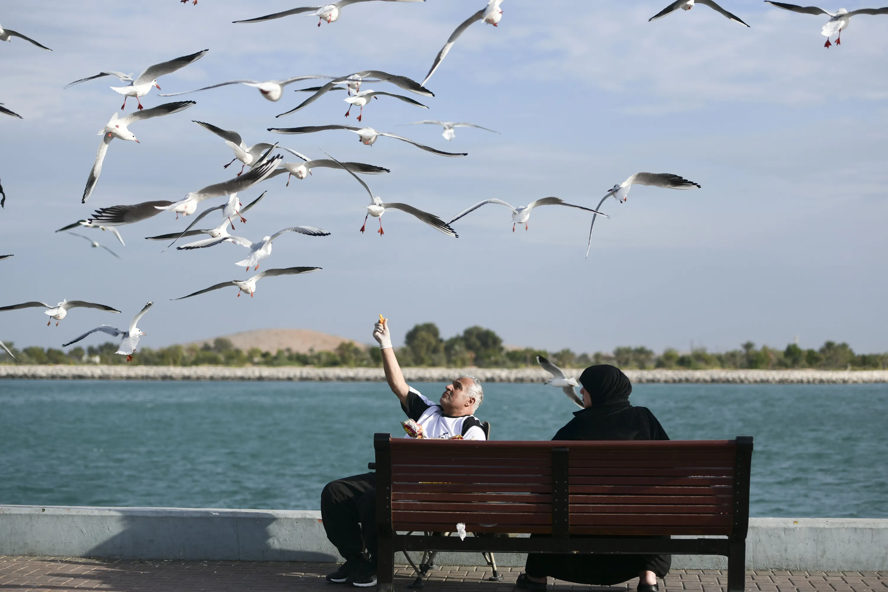 Man feeding birds at the Corniche in Abu Dhabi on January 3, 2023. (Photo by Khushnum Bhandari/The National)