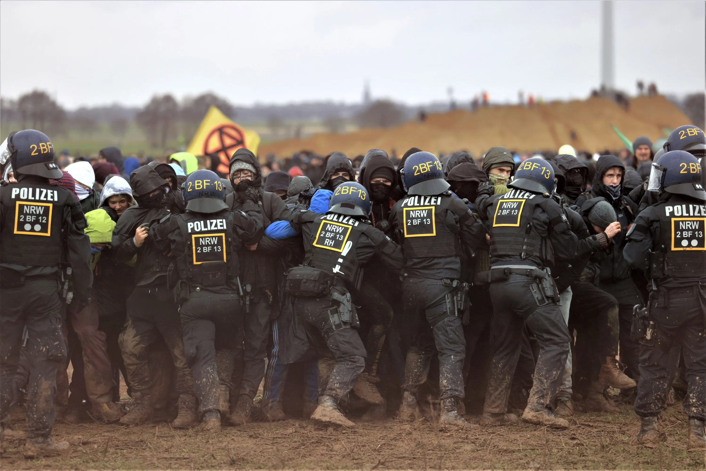 Police officers push back demonstrators on the edge of the opencast lignite mine Garzweiler at the village Luetzerath near Erkelenz, Germany, Saturday, January 14, 2023. (Photo by Oliver Berg/dpa via AP Photo)