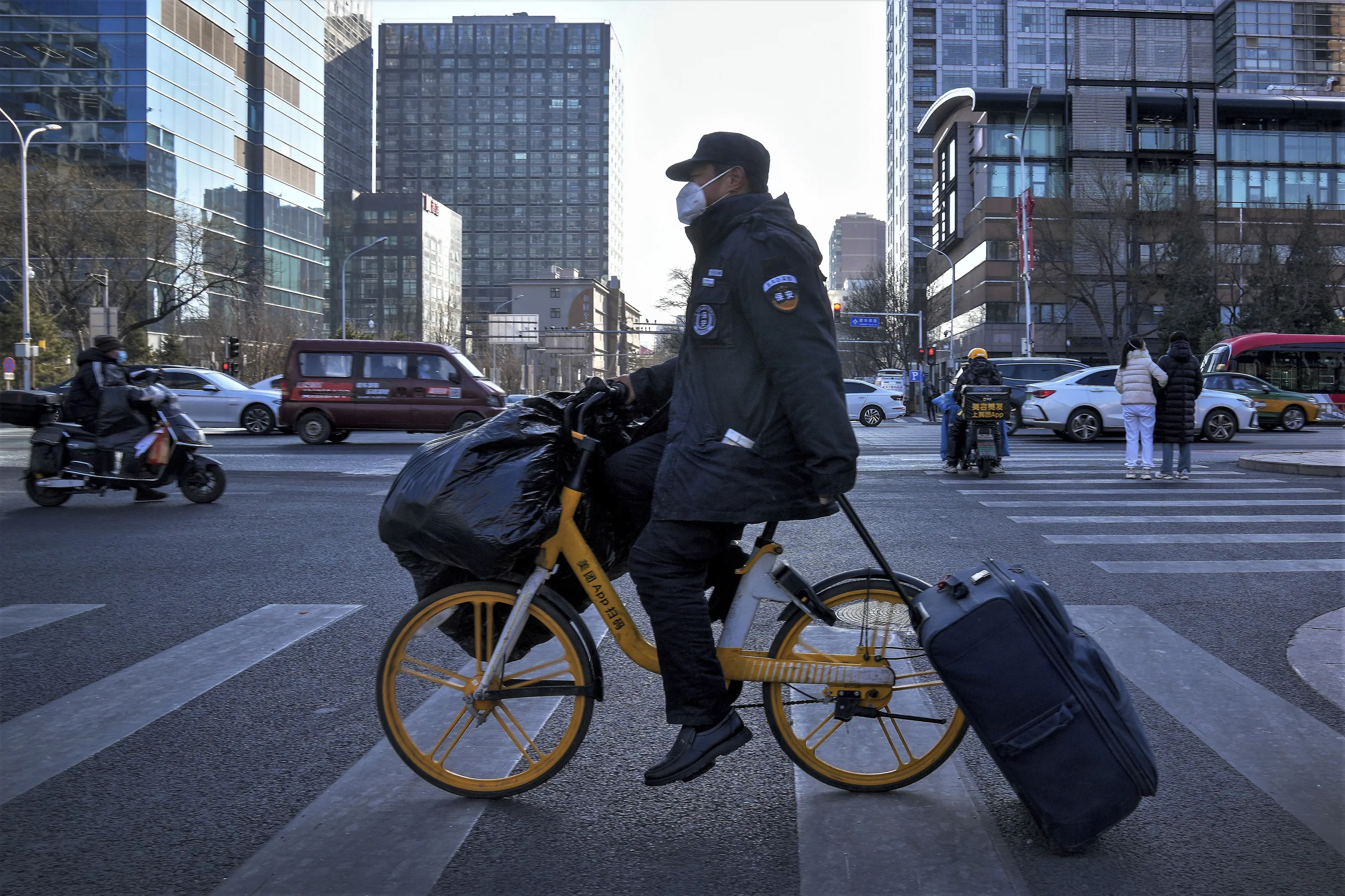 A security guard wearing a face mask and using a bike-sharing service carries his belonging rides across a street in Beijing, Monday, January 9, 2023. China's healthcare authorities declined to include Pfizer's COVID-treatment drug in a national reimbursement list that would've allowed patients to get it at a cheaper price throughout the country, saying it was too expensive. (Photo by Andy Wong/AP Photo)