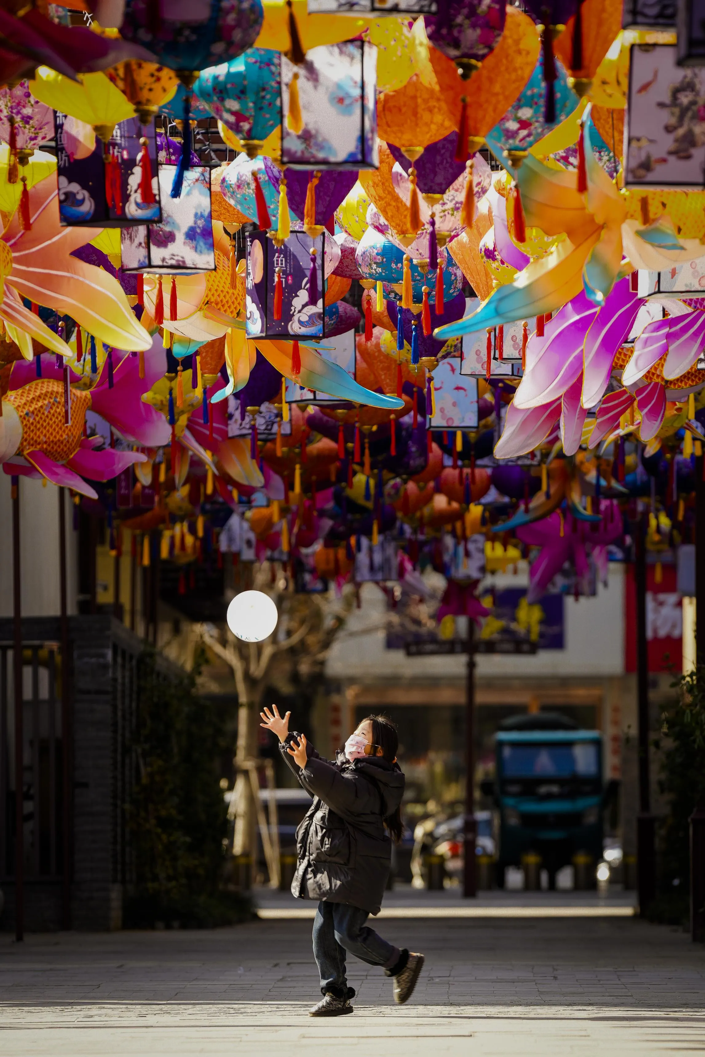 A child plays a balloon under lanterns at a pedestrian street ahead of the Chinese New Year, the Year of the Rabbit, on January 10, 2023 in Changxing County, Huzhou City, Zhejiang Province of China. (Photo by VCG/VCG via Getty Images)