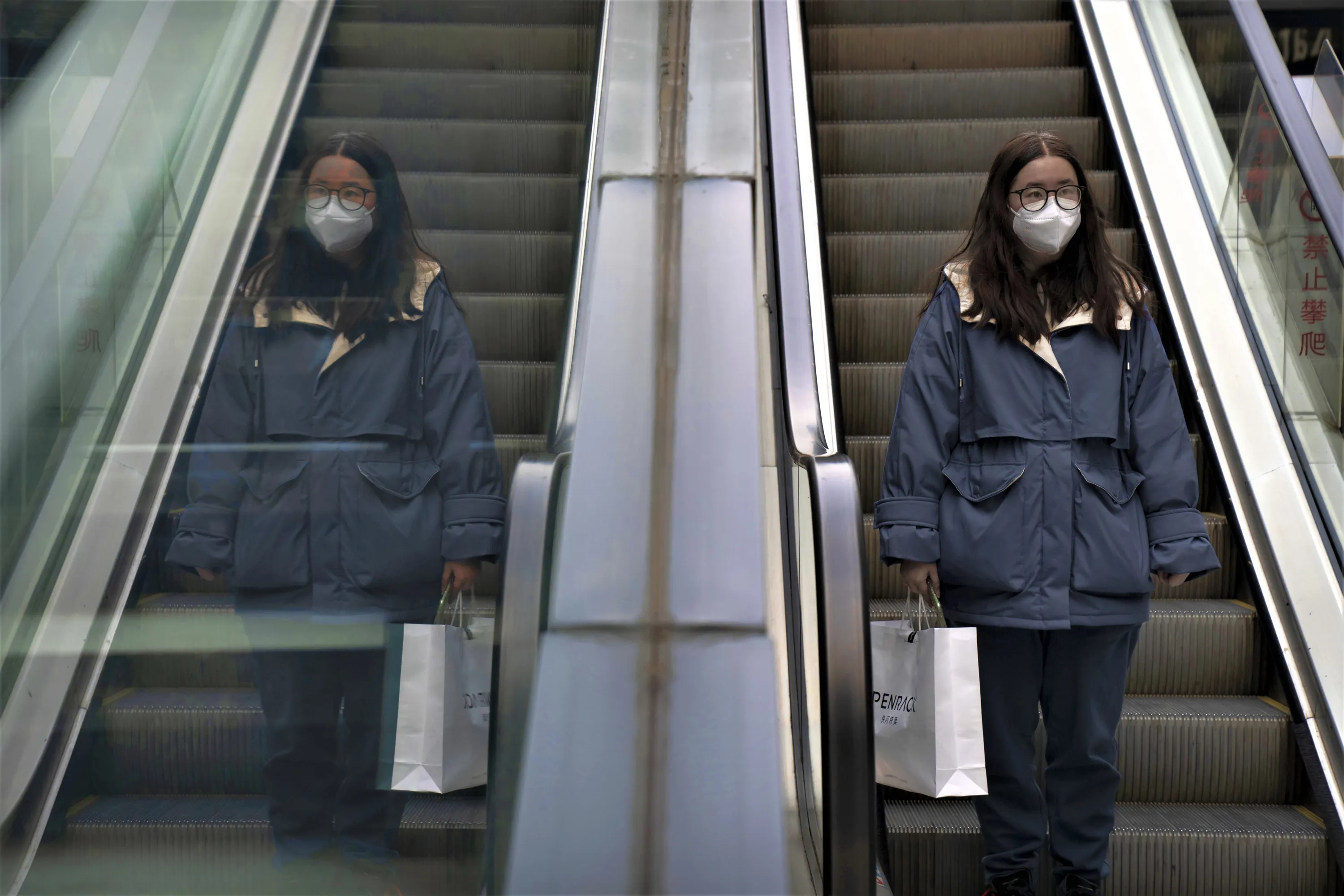 A woman wearing a face mask rides an escalator at a shopping and office complex in Beijing, Wednesday, January 11, 2023. Japan and South Korea on Wednesday defended their border restrictions on travelers from China, with Tokyo criticizing China's move to suspend issuing new visas in both countries as a step unrelated to virus measures. (Photo by Mark Schiefelbein/AP Photo)