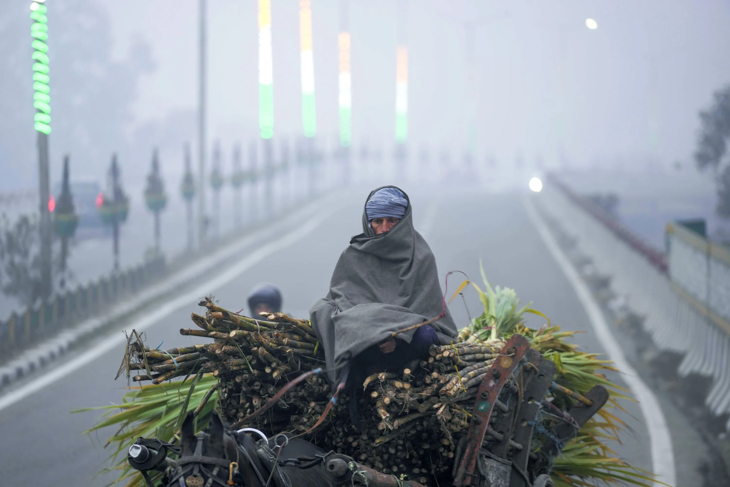 A man covers himself with a blanket and rides on a horse cart on a cold and foggy morning in Jammu, India, Monday, January 9, 2023. (Photo by Channi Anand/AP Photo)