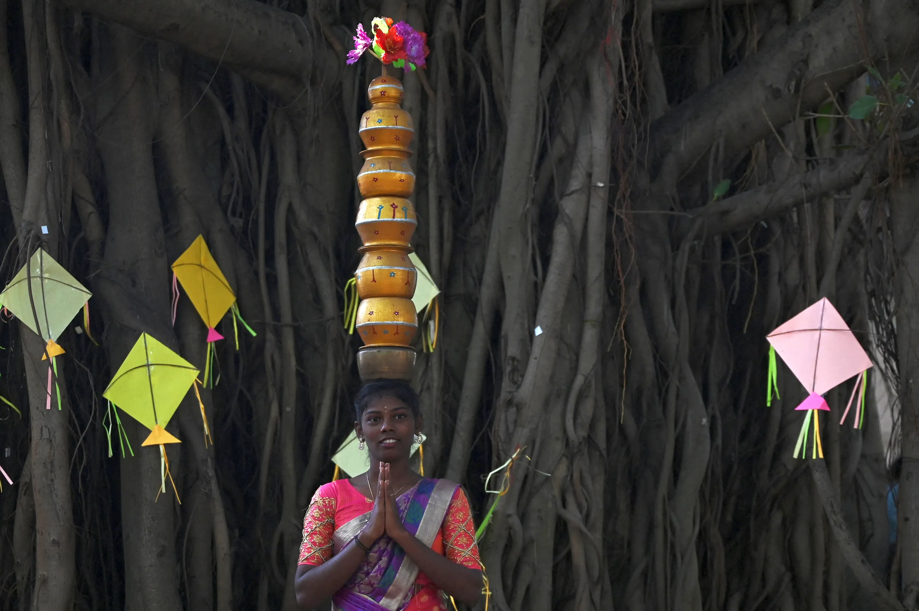 A students performs a Karagattam folk dance during celebrations for “Pongal”, the Tamil harvest festival, at a college in Chennai on January 12, 2023. (Photo by Arun Sankar/AFP Photo)