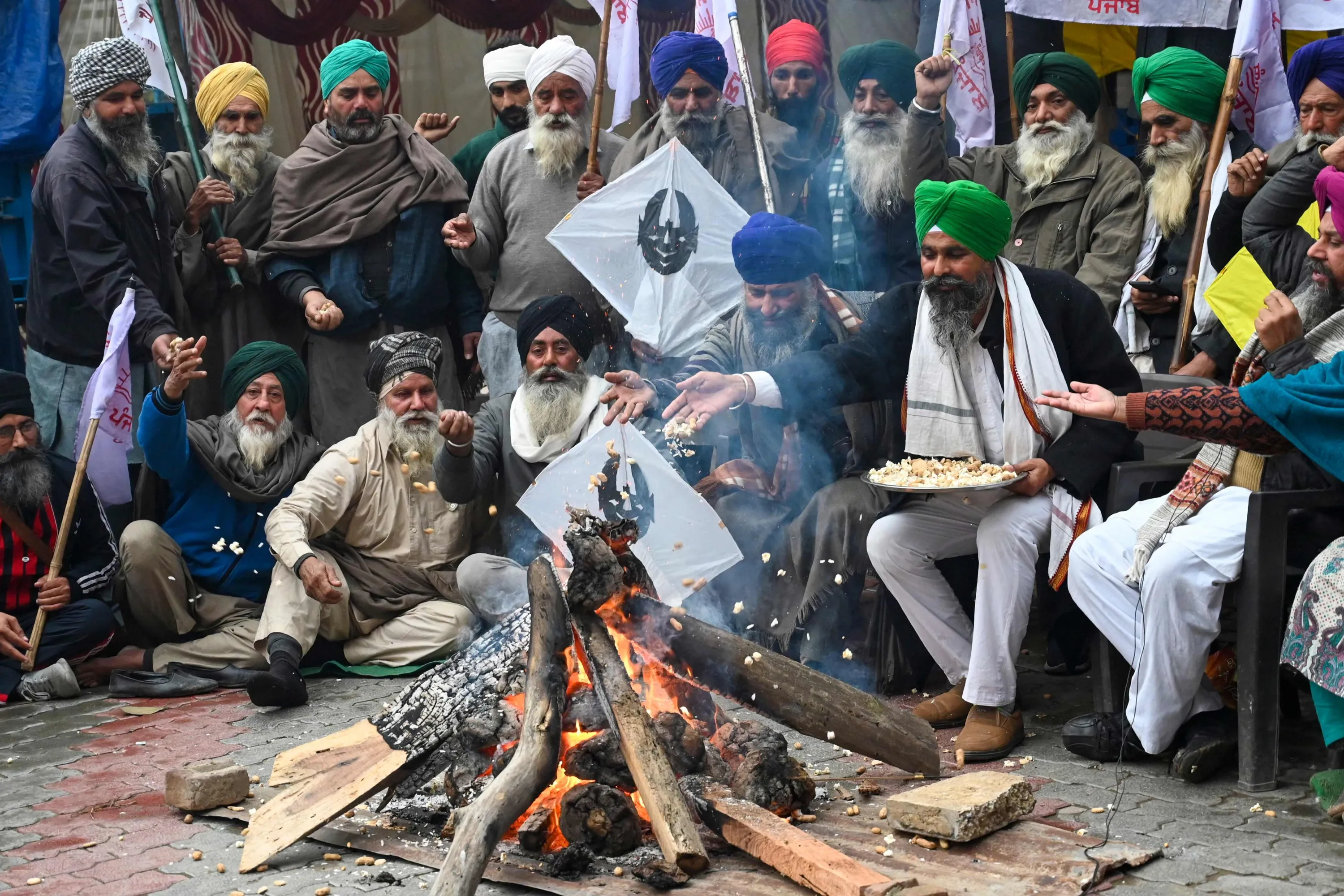 Farmers gather around a bonfire to celebrate Lohri festival while they protest against the central and state government for loan waivers, pensions, crop insurance and minimum support price (MSP), in Amritsar on January 13, 2023. (Photo by Narinder Nanu/AFP Photo)