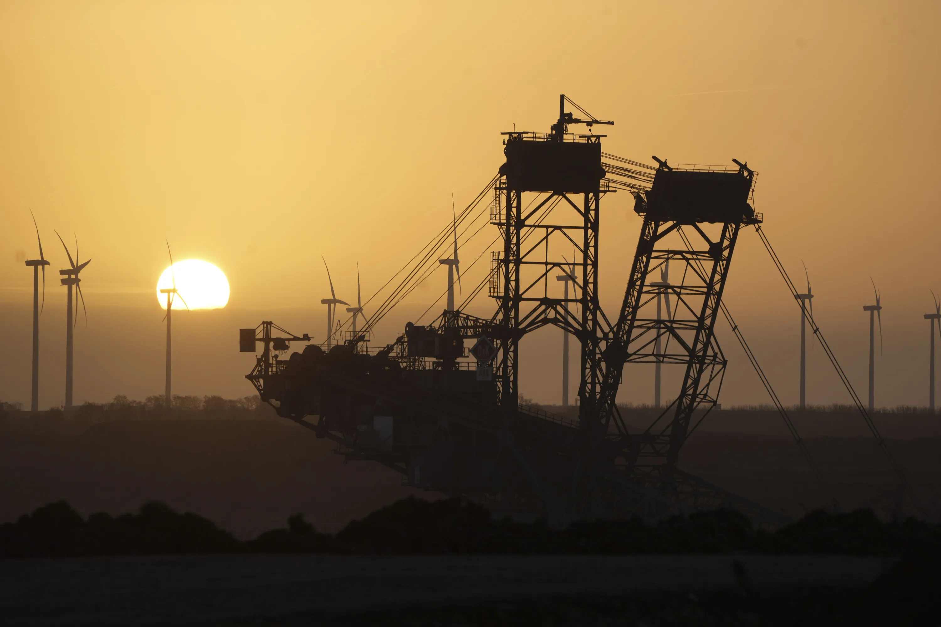 The sun rises behind a lignite excavator at the Garzweiler lignite coal mine near the village of Luetzerath, Erkelenz, Germany, Tuesday, January 10, 2023. The village of Luetzerath has to be demolished to expand the Garzweiler lignite coal mine near the dutch border. (Photo by Michael Probst/AP Photo)