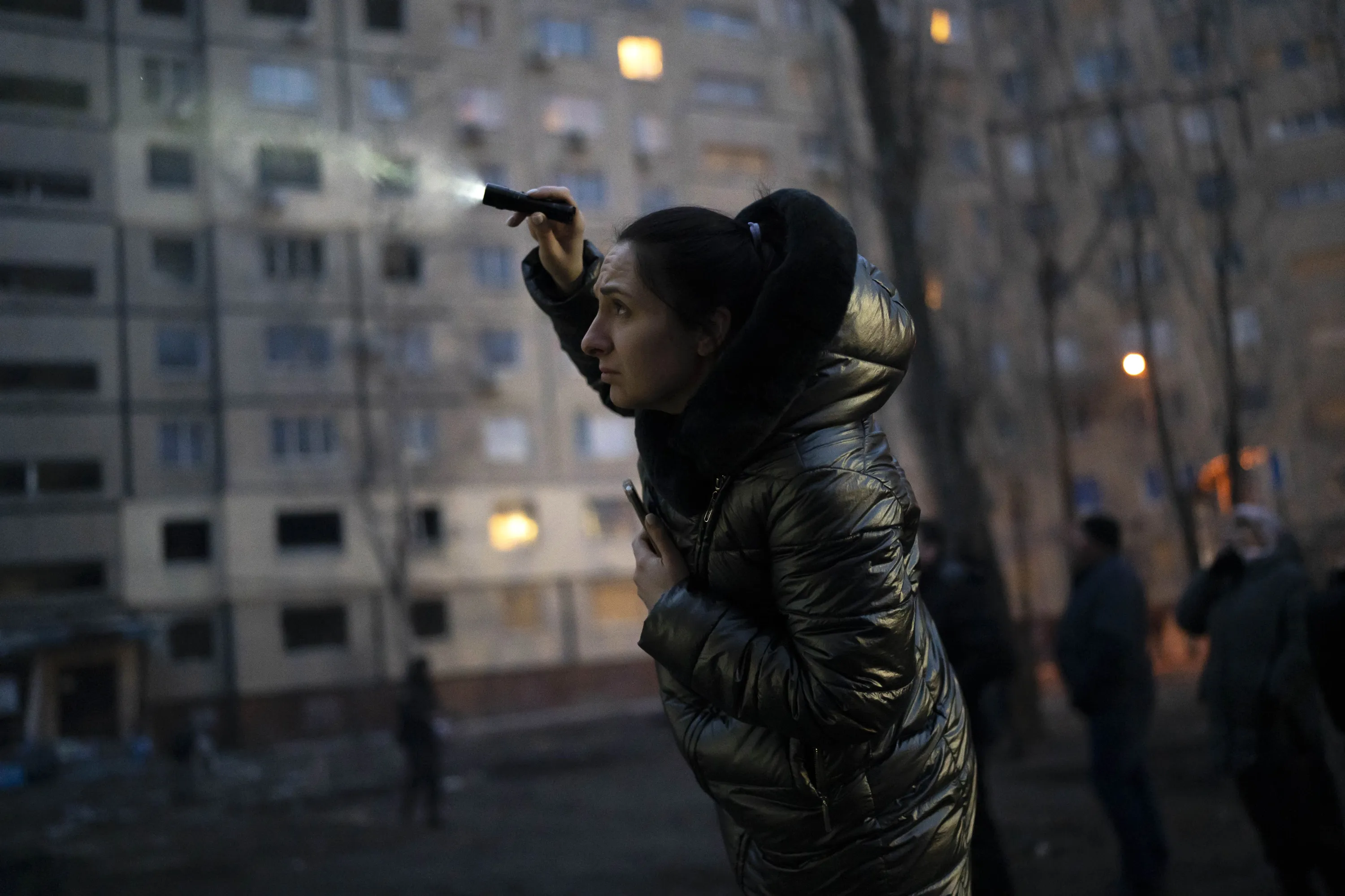 Nadiia Yaroshenko, 38, desperately trying to locate her cat with a torch, that remains trapped in the damaged building on the edge to collapse in Dnipro, Ukraine, Tuesday, January 17, 2023. The white cat with blue and yellow eyes refused to go with the emergency service workers who tried to rescue him. He remains on his favourite place on the window that is blown out. The final death toll from a weekend Russian missile strike on an apartment building in southeastern Ukraine reached 45, officials said Tuesday, as the body of another child was pulled from the wreckage. The strike in the city of Dnipro was the war's deadliest attack since the spring on civilians at one location. (Photo by Roman Hrytsyna/AP Photo)