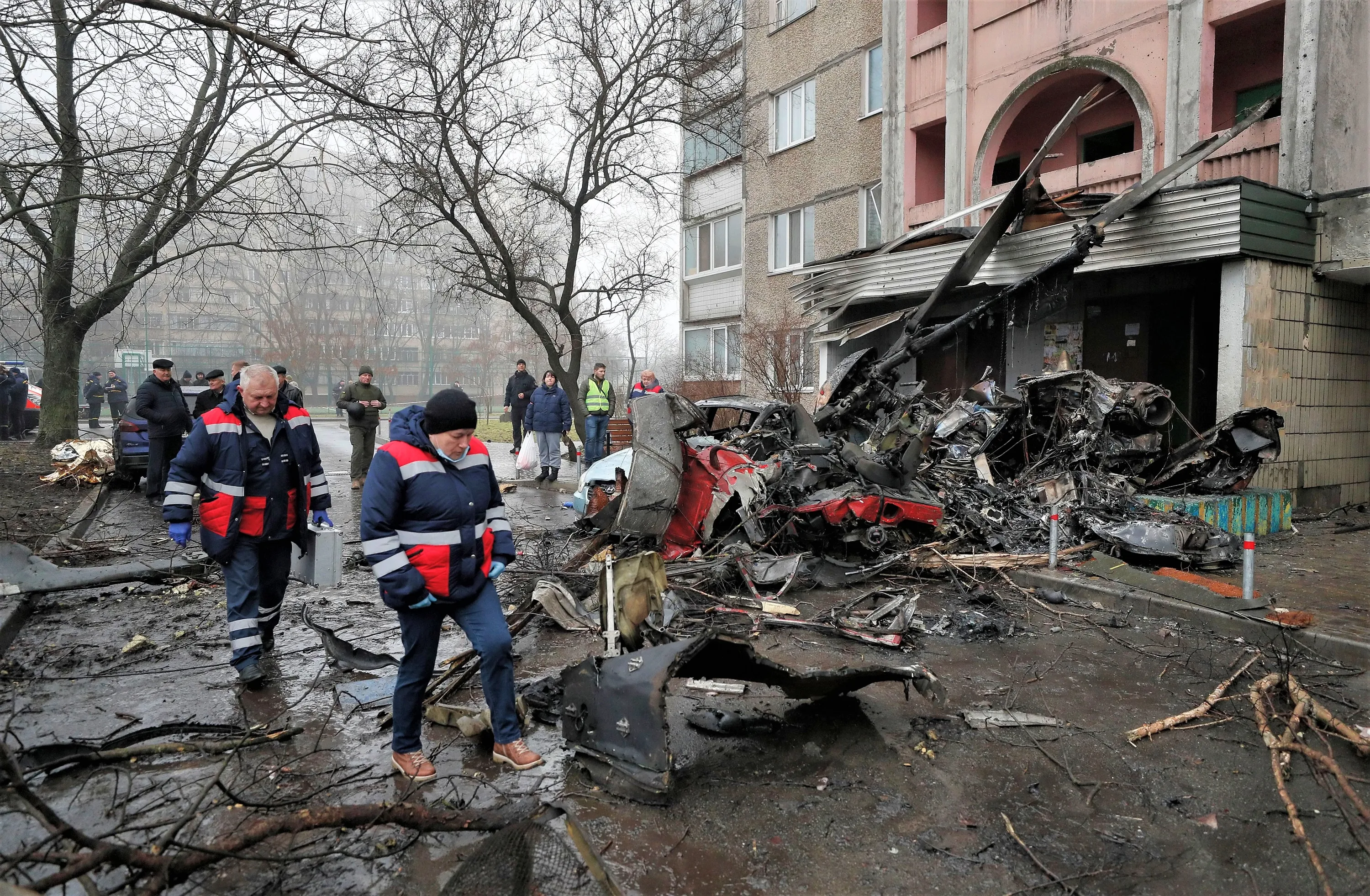 Rescue services and medical workers at the scene of a helicopter crash near the wreckage in Brovary, near Kyiv, Ukraine, 18 January 2023. At least 18 people died, including three children, after a helicopter crashed near a kindergarten and a residential building in the city of Brovary, Oleksiy Kuleba, the head of Kyiv Regional Military Administration wrote on telegram. “Among them are Minister of Internal Affairs of Ukraine Denys Monastyrskyi, his first deputy Yevhen Yenin, State Secretary of the Ministry of Internal Affairs Yuri Lubkovych, their assistants and the helicopter crew”, stated President of Ukraine Volodymyr Zelensky. (Photo by Sergey Dolzhenko/EPA/EFE/Rex Features/Shutterstock)