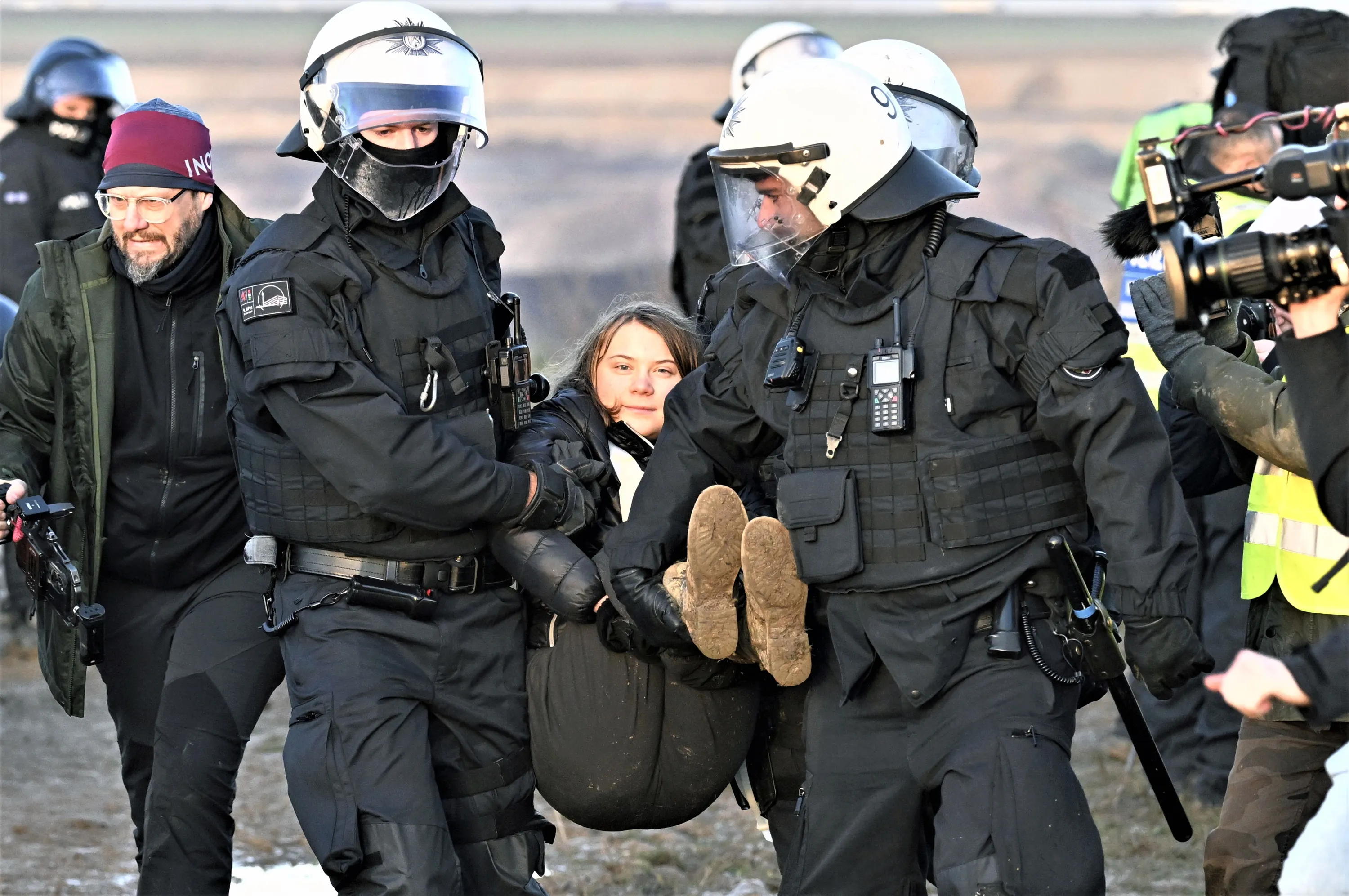Police officers carry Swedish climate activist Greta Thunberg away from the edge of the Garzweiler II opencast lignite mine during a protest action by climate activists after the clearance of Luetzerath, Germany, Tuesday, January 17, 2023. After the eviction of Luetzerath ended on Sunday, coal opponents continued their protests on Tuesday at several locations in North Rhine-Westphalia. (Photo by Federico Gambarini/dpa via AP Photo)