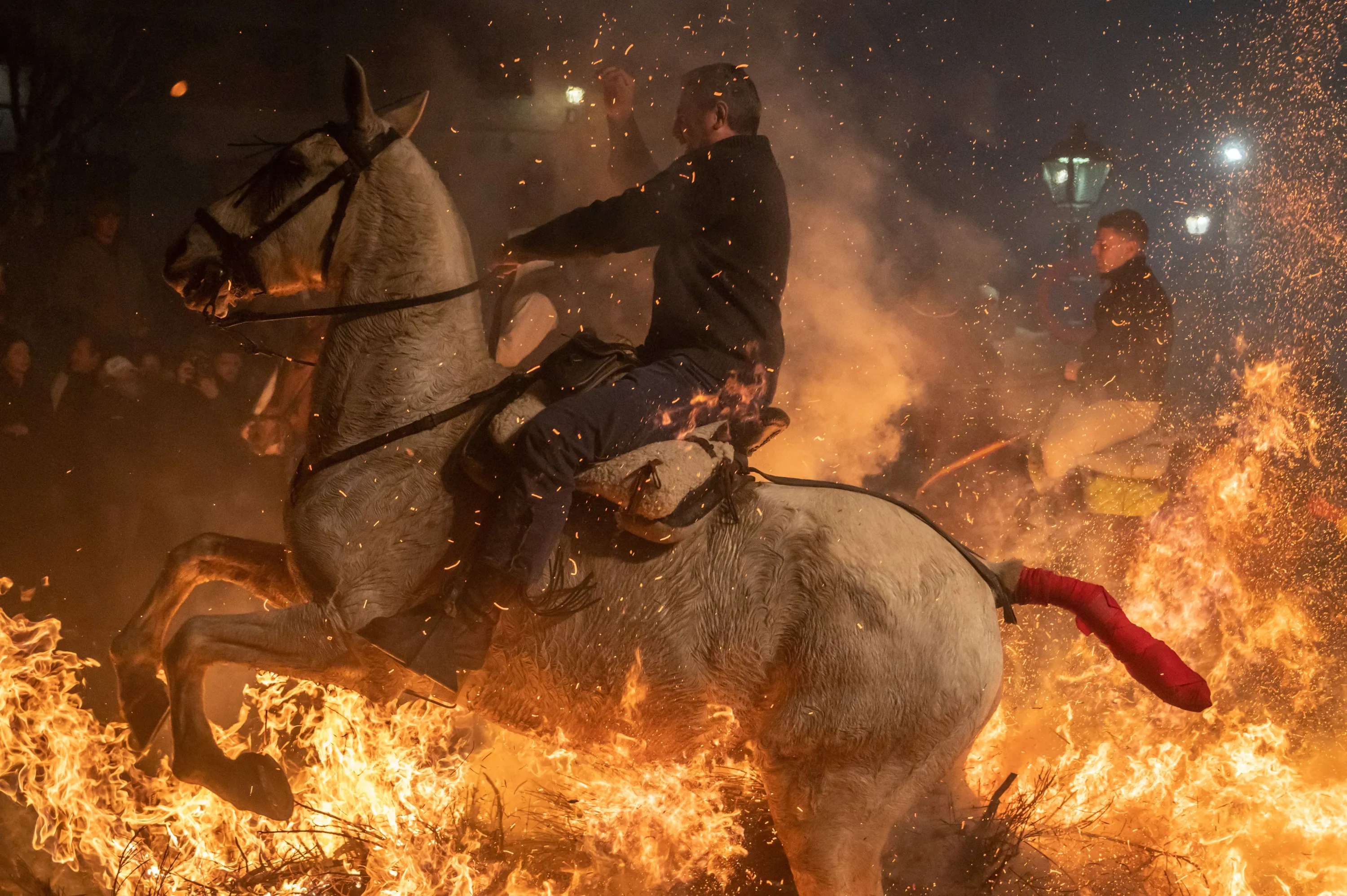 A horse rider jumps over a bonfire on January 16, 2023 in San Bartolome de Pinares, Spain. Horse riders jump over bonfires during the traditional ritual in honor of San Antonio Abad (Saint Anthony the Abbot), patron saint of domestic animals known as Las Luminarias, which is meant to purify the animals with the smoke of the bonfires and protect them for the year to come. (Photo by Marcos del Mazo/Getty Images)