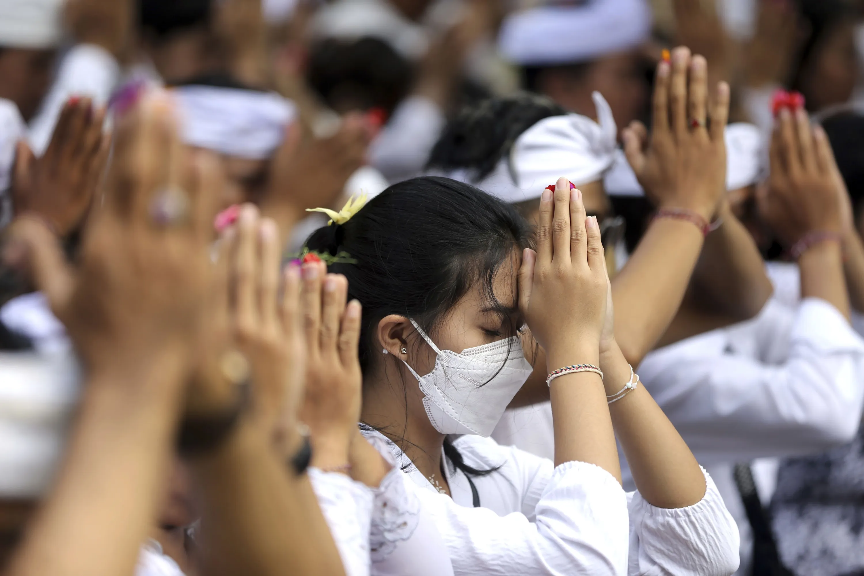 Devotees pray during the Hindu festival of Galungan, the celebration of the triumph of good over evil, at a temple in Bali, Indonesia on Wednesday, January 4, 2023. (Photo by Firdia Lisnawati/AP Photo)