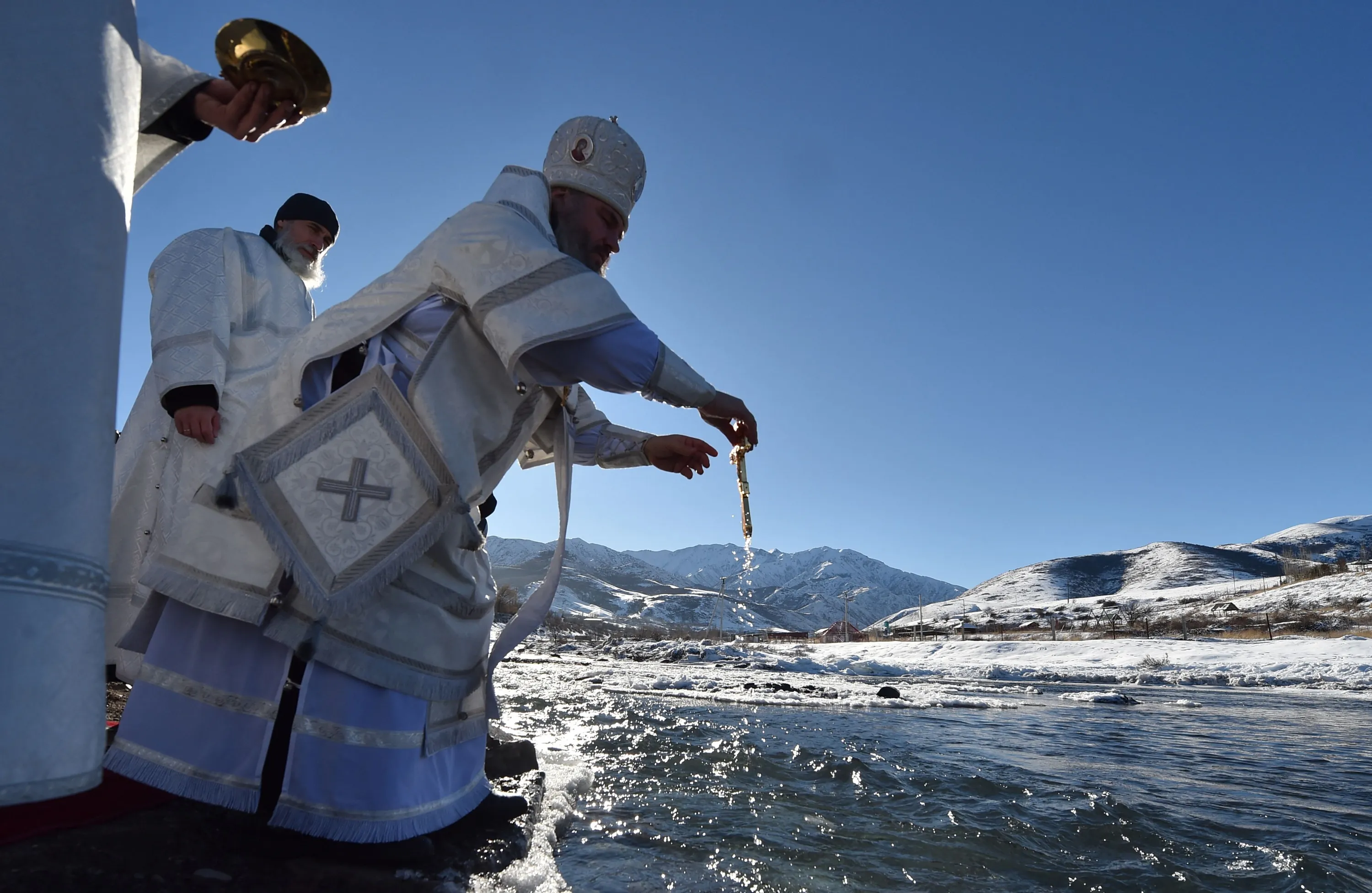 An Orthodox priest blesses the water of the Kara-Balta river during the celebration of the Epiphany holiday near the village of Sosnovka, some 90 kms from Bishkek, on January 19, 2023. Among Orthodox Christians, the feast of Epiphany celebrates the day the spirit of God descended upon believers in the shape of a dove during Jesus Christ's baptism in the River Jordan. (Photo by Vyacheslav Oseledko/AFP Photo)