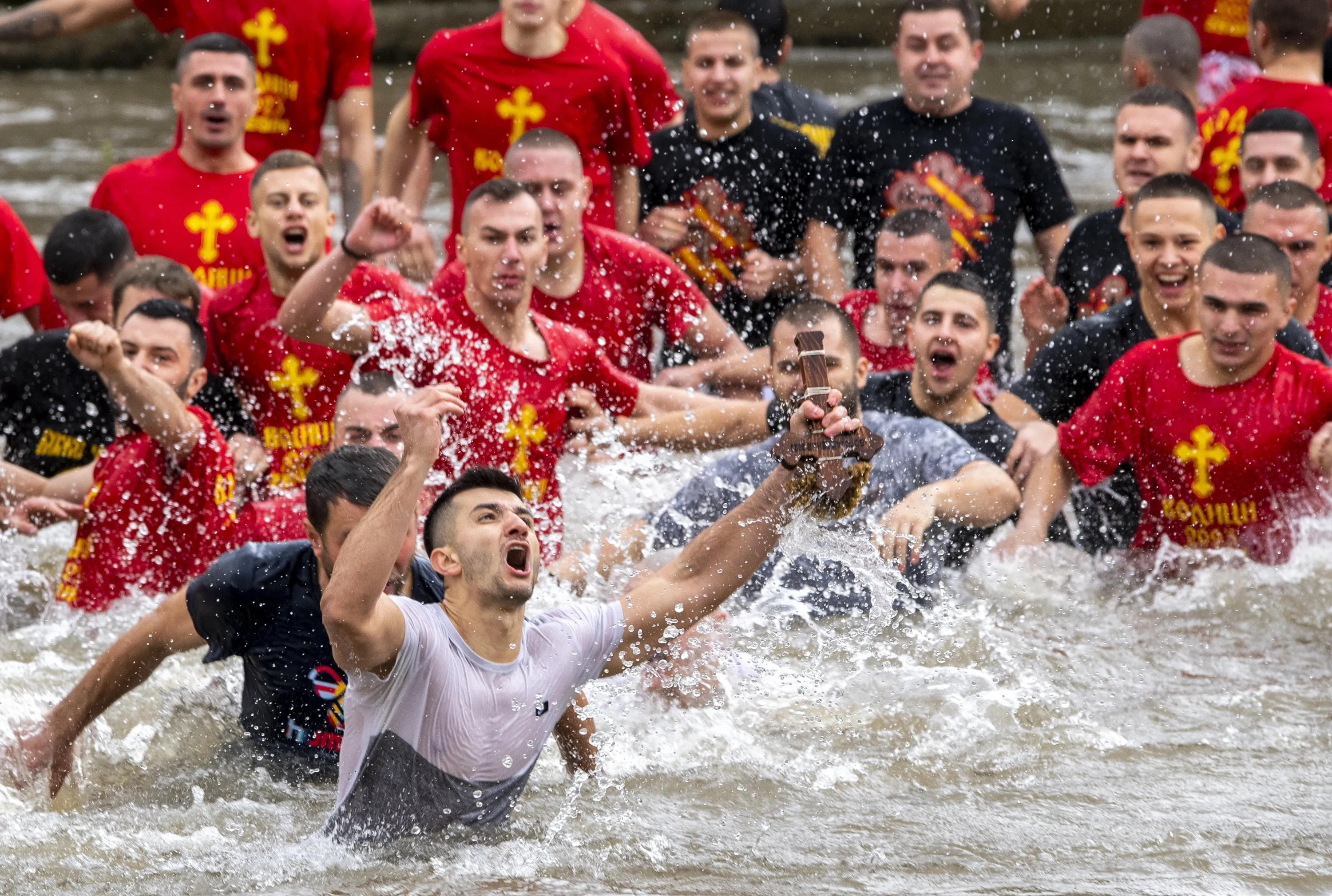Kristijan Nineski, 26-years-old Macedonian, catches the cross which was thrown in the Vardar river by the head of the Macedonian Orthodox church, Archbishop Stefan, during Epiphany day celebrations in Skopje, Republic of North Macedonia, 19 January 2023. Young Macedonians jump into the icy water as they compete to catch the cross in the Vardar river in Skopje on Epiphany day. According to the beliefs of the Eastern Orthodox church the first man who catches the cross thrown into the water will be healthy throughout the whole year. (Photo by Georgi Licovski/EPA/EFE)