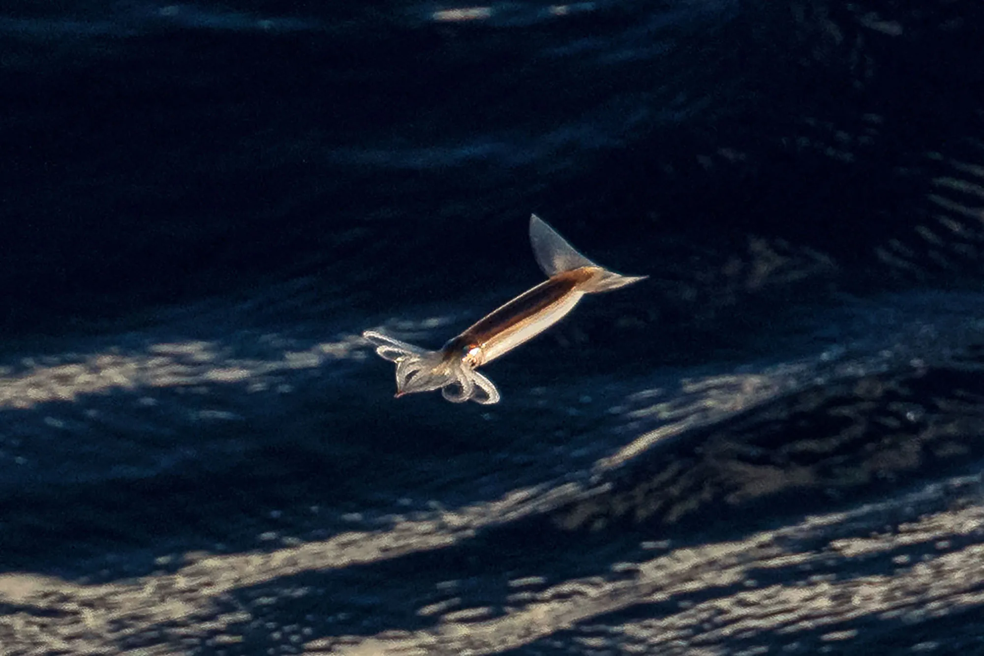 This photograph taken on January 9, 2023 shows a squid flying out of water next to the multi purpose vessel “Marion Dufresne” sailing on the way back from Amsterdam islands to La Reunion, after a rotation of the five administrative districts of the French Southern and Antarctic Territories. (Photo by Patrick Hertzog/AFP Photo)