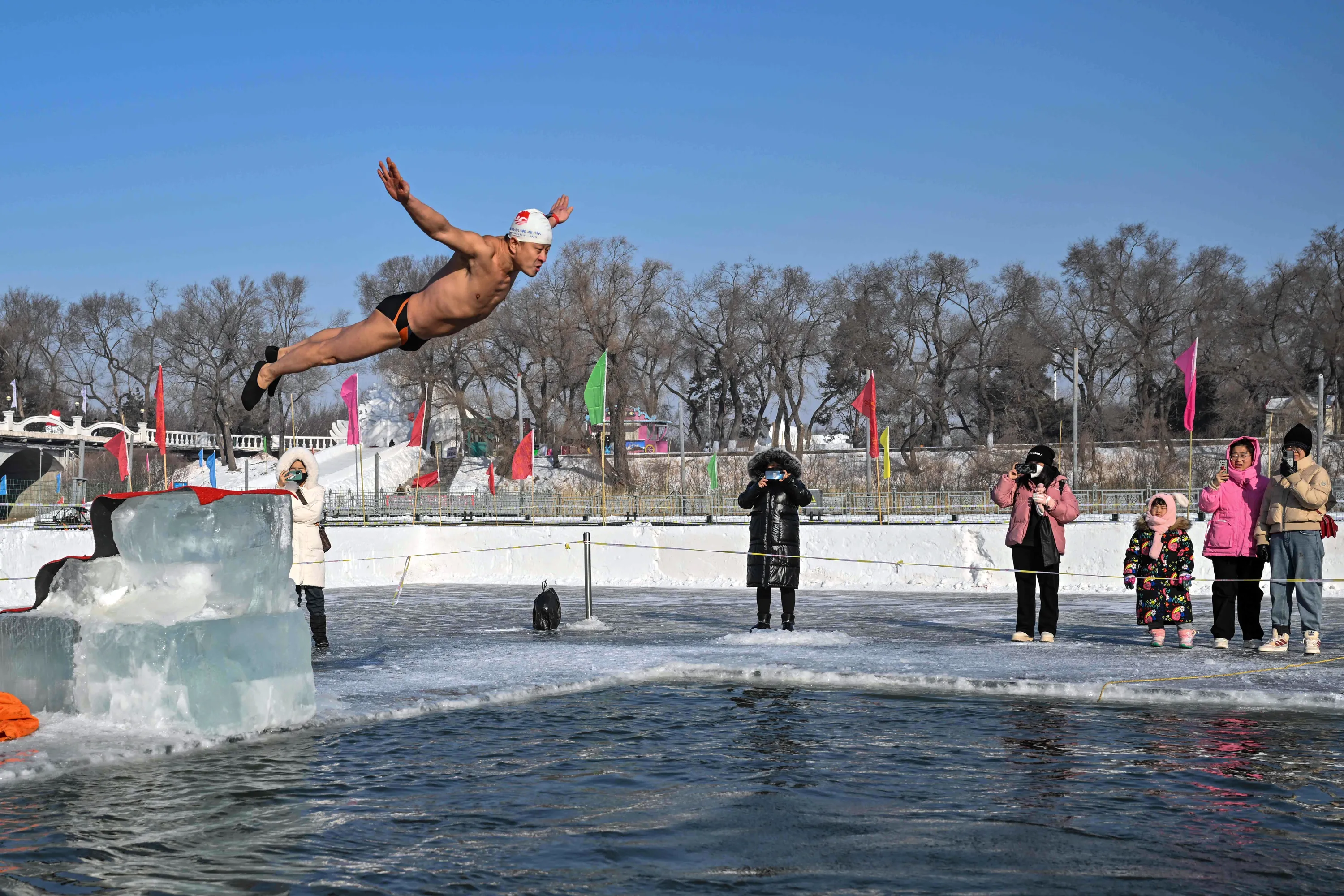 A man dives into a pool cut into the frozen Songhua river in Harbin, in China's northeastern Heilongjiang province on January 5, 2023, ahead the opening ceremony of the 39th Harbin China International Ice and Snow Festival. (Photo by Hector Retamal/AFP Photo)