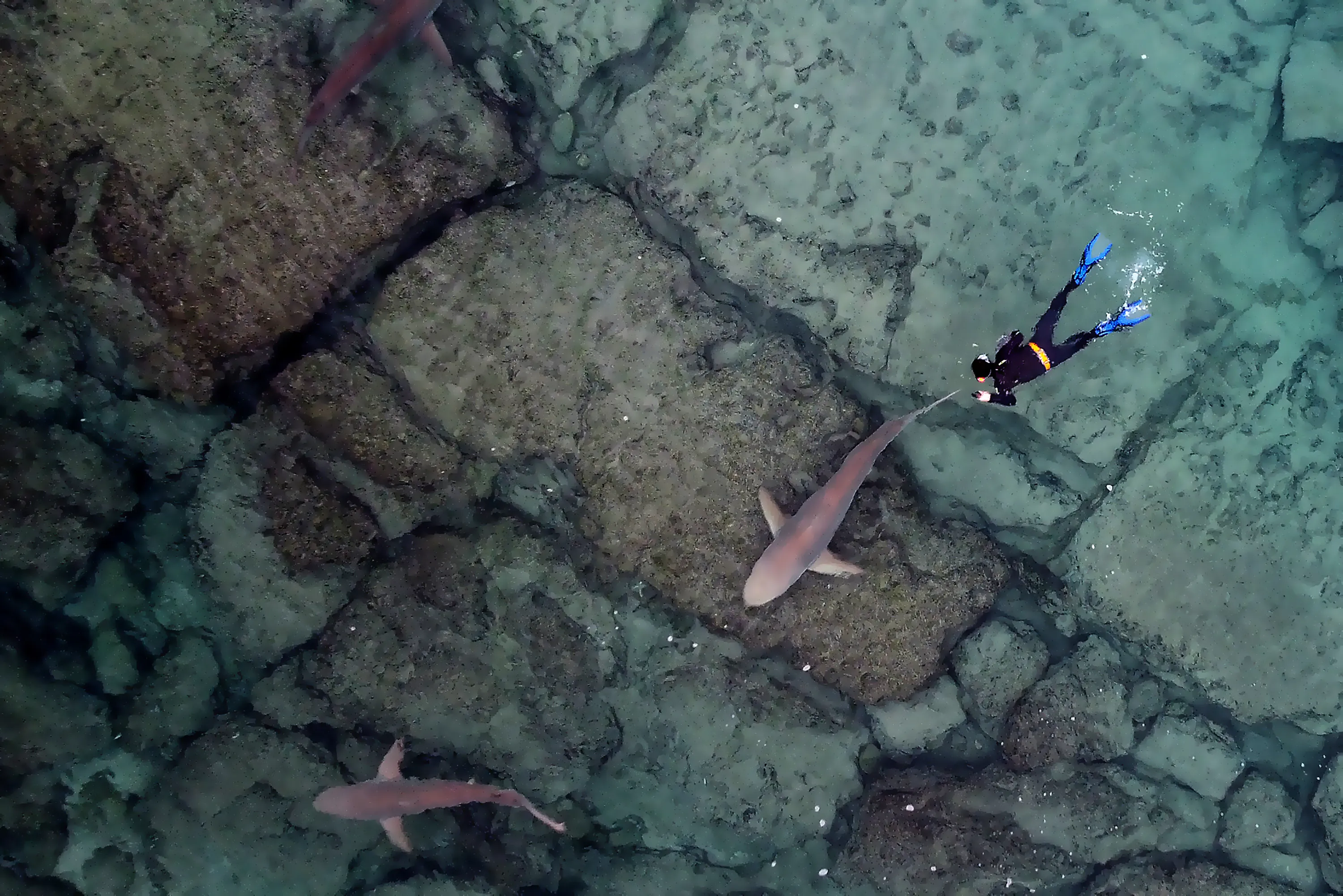 A Snorkeler swims with a group of Sandbar sharks in the Mediterranean Sea near the “Orot Rabin” industrial plant near the city of Hadera on January 2, 2023 in Hadera, Israel. The hot water rejection from an industrial plant in Israel's northern city of Hadera draws these Sandbar sharks and Dusky sharks, harmless and endangered by overfishing. (Photo by Amir Levy/Getty Images)