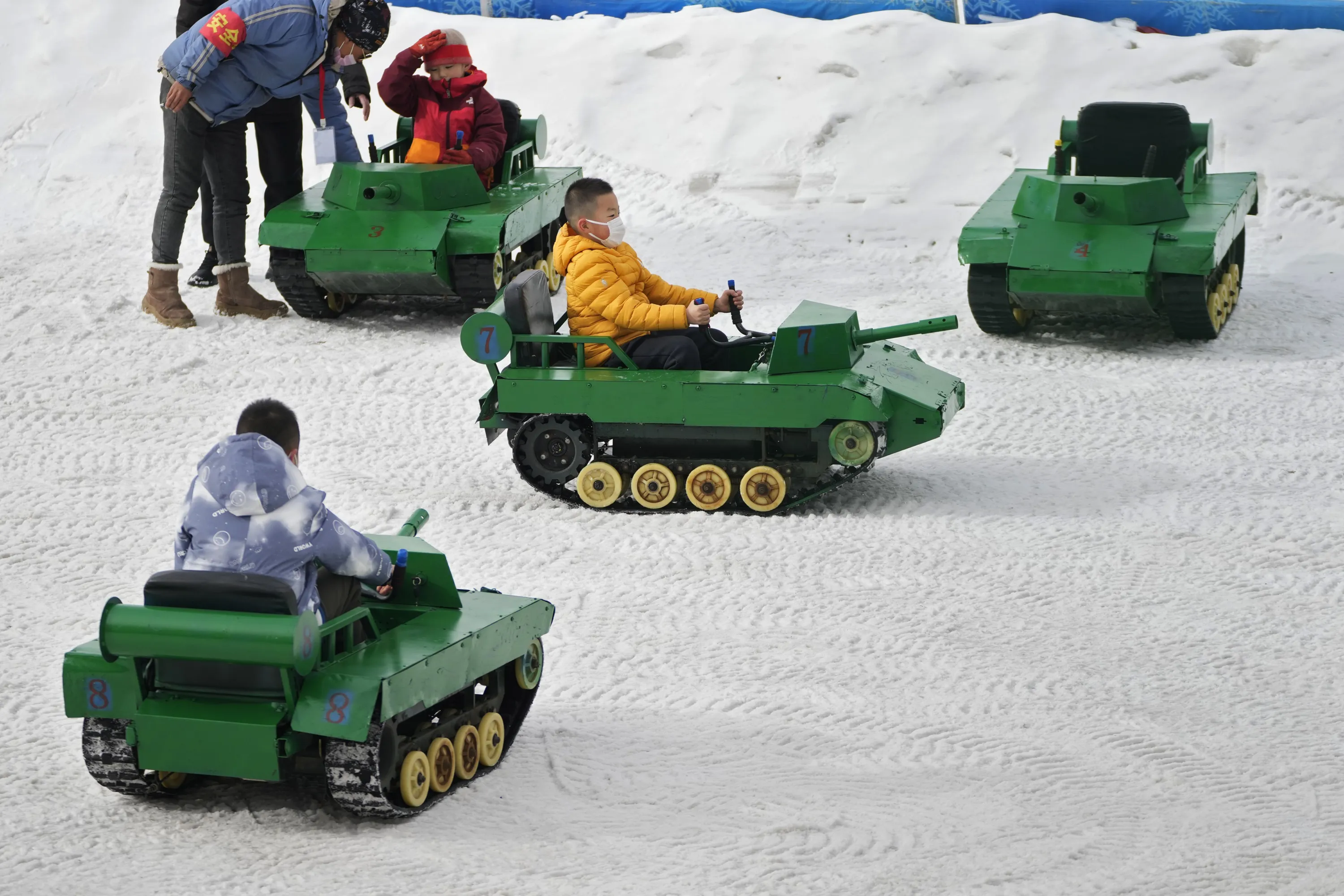 Children ride on toy tanks in the snow at a public park in Beijing, Thursday, January 19, 2023. (Photo by Andy Wong/AP Photo)
