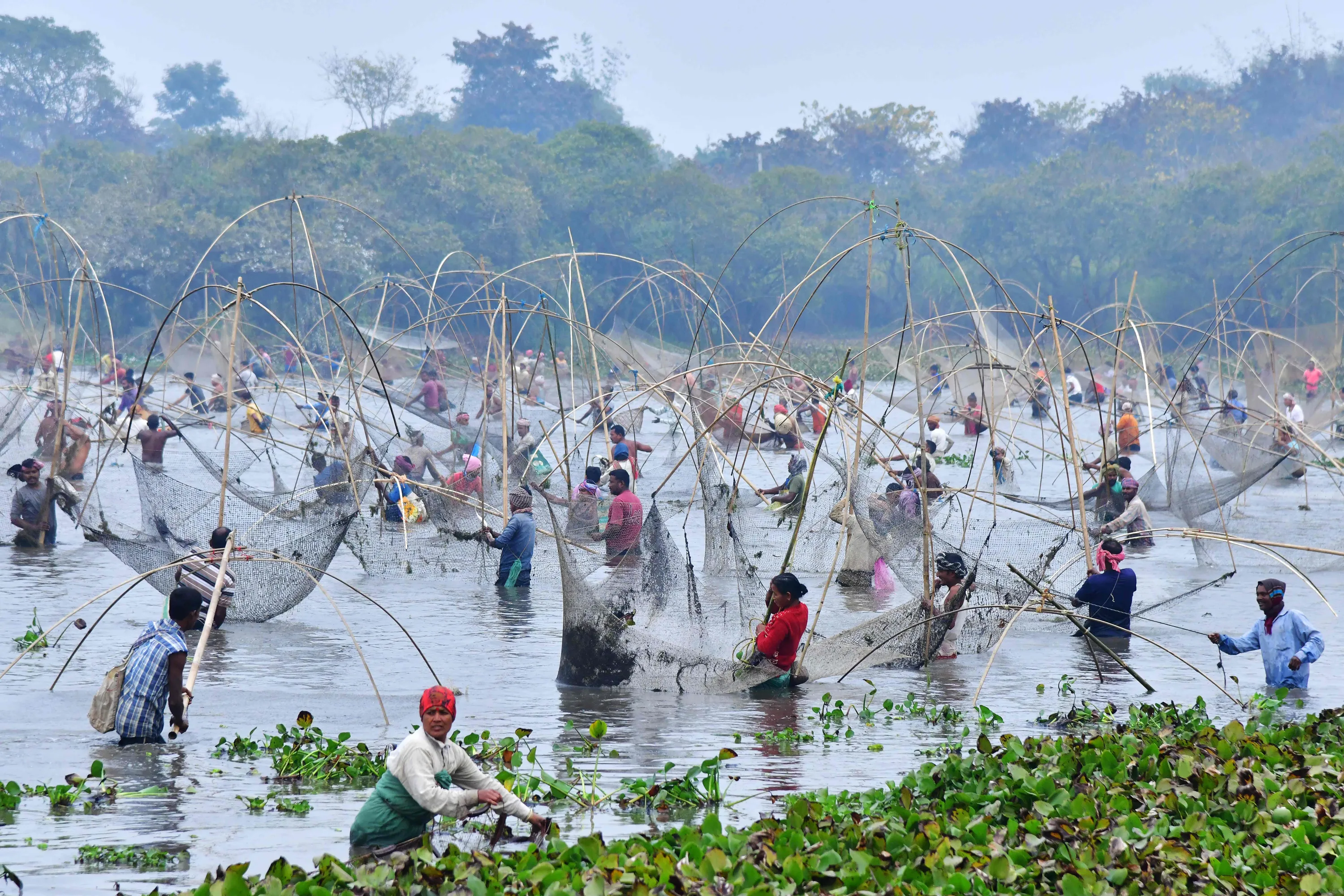 Villagers participate in a community fishing event during “Bhogali Bihu” harvest celebrations at Goroimari Lake in Panbari, Kamrup district, in India's Assam state on January 14, 2023. (Photo by Biju Boro/AFP Photo)