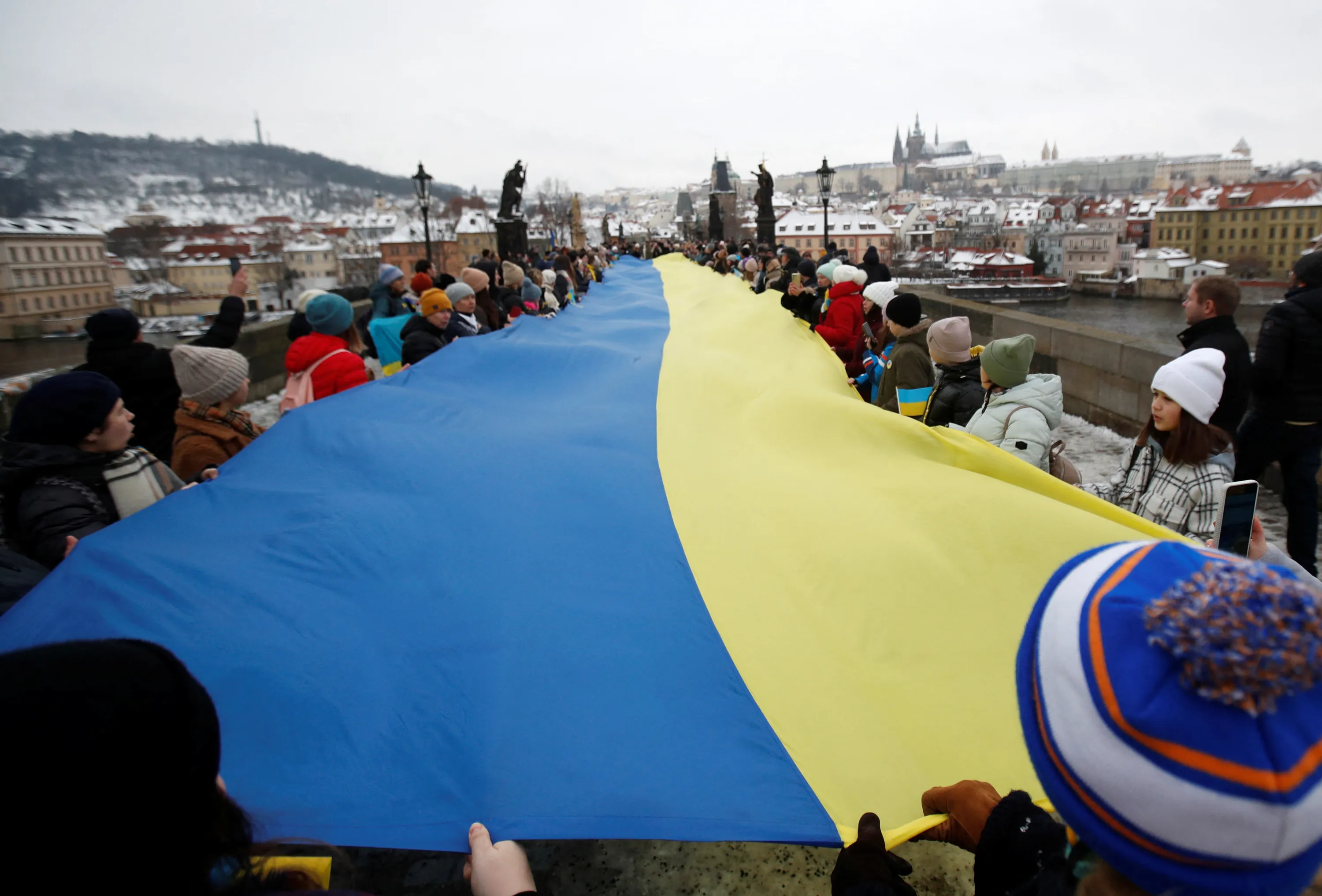 People hold up a giant Ukrainian national flag to mark the Day of Unity of Ukraine at the medieval Charles Bridge in Prague, Czech Republic on January 22, 2023. (Photo by David W. Cerny/Reuters)