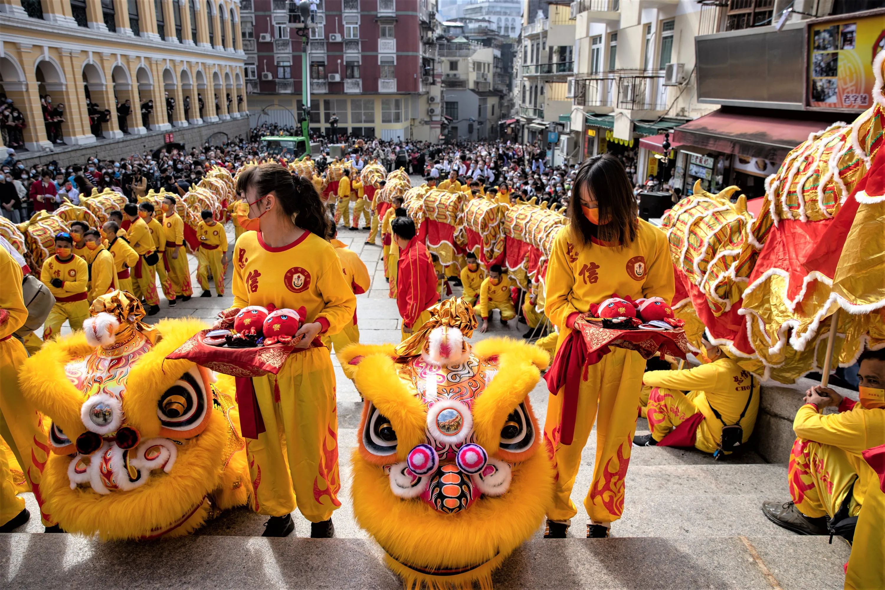 Worshippers prepare for a dragon dance to celebrate the Chinese lunar new year in Macau, China, 22 January 2023. Macau borders reopened earlier this month and the city has launched a promotional campaign to boost tourism, offering Hong Kong residents a “half-price” round-trip if travellers spend a night there during the Chinese Lunar New Year period. The Chinese lunar new year, also called “Spring Festival”, falls on 22 January 2023, marking the beginning of the Year of the Rabbit. (Photo by Jerome Favre/EPA/EFE)
